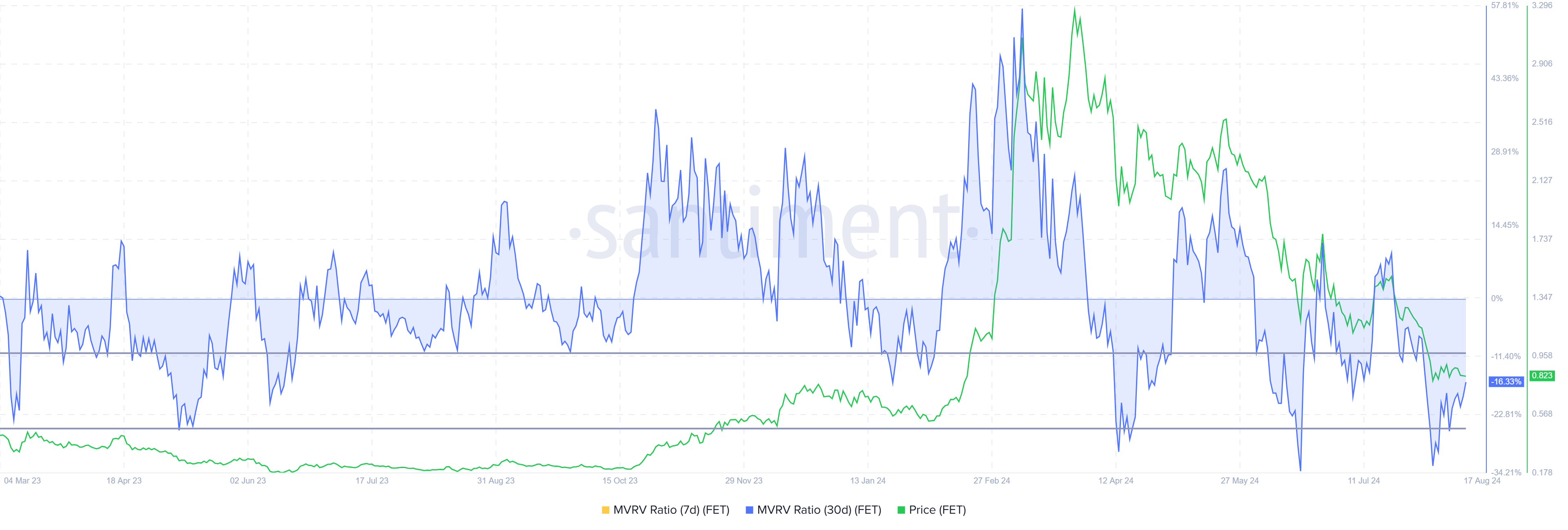 MVRV-förhållandet bedömer investerares vinst och förlust. För närvarande ligger FET:s 30-dagars MVRV på -16%, vilket indikerar förluster och möjlig köppress. Historiskt sett signalerar FET:s MVRV mellan -10% och -25% vanligtvis starten på uppgångar, vilket markerar det som en ackumuleringsmöjlighet.