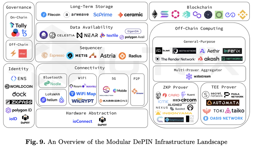 Dessutom har modulerna för sekvensering och datatillgänglighet anpassats från befintliga lösningar för att bättre passa DePin-applikationer. Långsiktiga lagringslösningar som Filecoin (FIL) och Arweave (AR) spelar en avgörande roll för att möta dessa applikationers lagringsbehov. Medan blockkedjeplattformar som Ethereum (ETH), IoTeX och Solana (SOL) tillhandahåller viktig infrastruktur för utveckling.