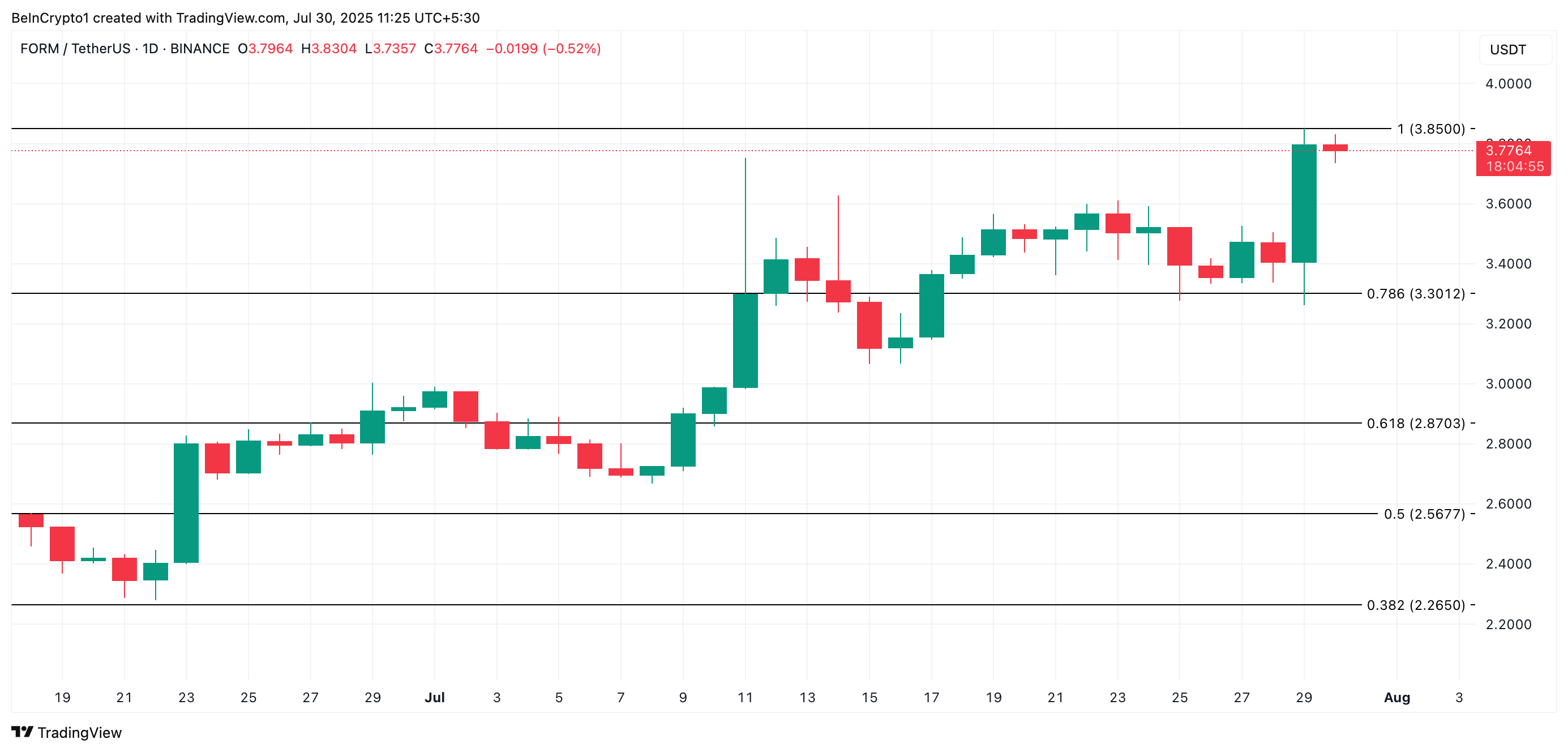 FORM är dagens största marknadsvinnare, med en prisökning på 11 % de senaste 24 timmarna. Uppgången bygger på gårdagens momentum, när altcoinet nådde ett nytt rekord på 3,85 USD.