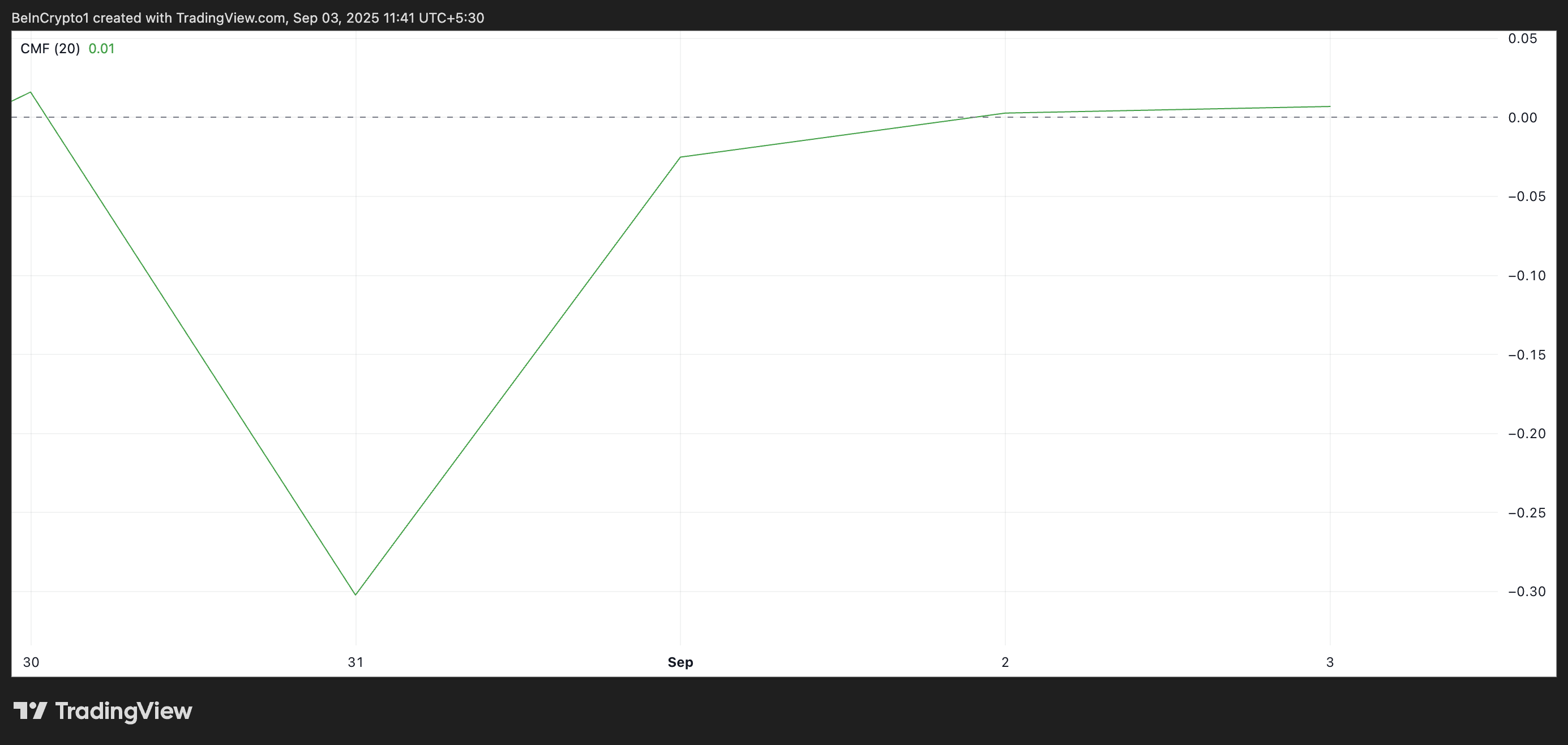 En tillgångs CMF-indikator mäter det volymviktade kapitalflödet in och ut ur den. När CMF trendar över noll, tyder det på att köpkraften överstiger säljtrycket, medan en nedgång under noll speglar ökad säljsidans dominans.