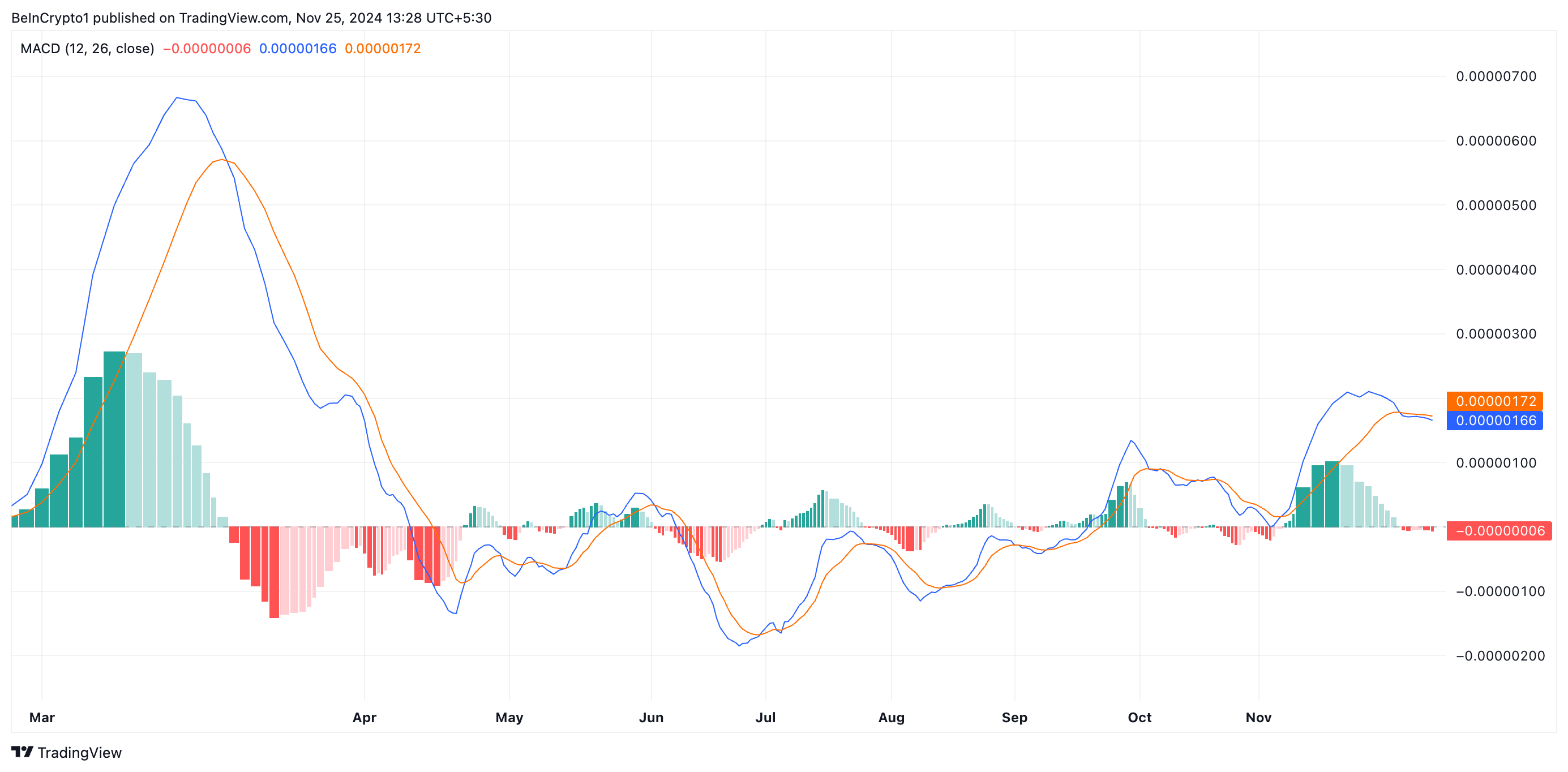 Å andra sidan, om vinsthemtagningsaktiviteten minskar och meme-coinen ser en ökning i ny efterfrågan, kommer den att bryta över motståndet vid 0,000026 USD för att återta sin åttamånadershögsta på 0,000030 USD.
