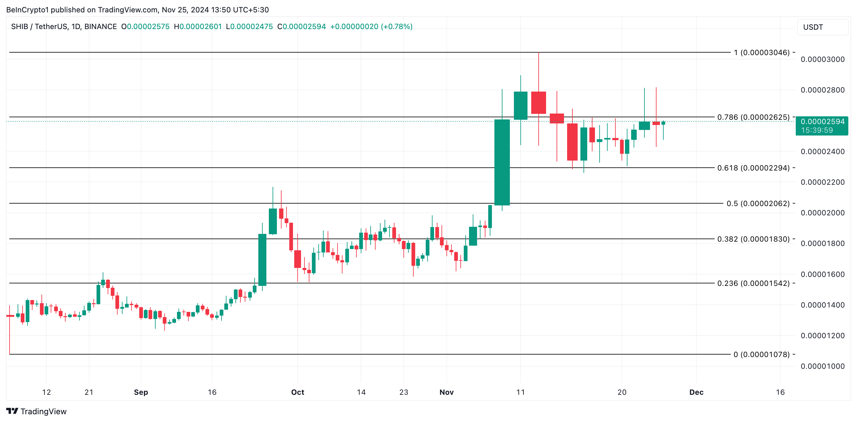 SHIB handlas till 0,000025 USD, vilket innebär en nedgång på 4 % under de senaste 24 timmarna. Det ligger fortfarande över det viktiga stödet vid 0,000022 USD. Om SHIB faller under detta stöd kan priset sjunka ytterligare till 0,000020 USD.