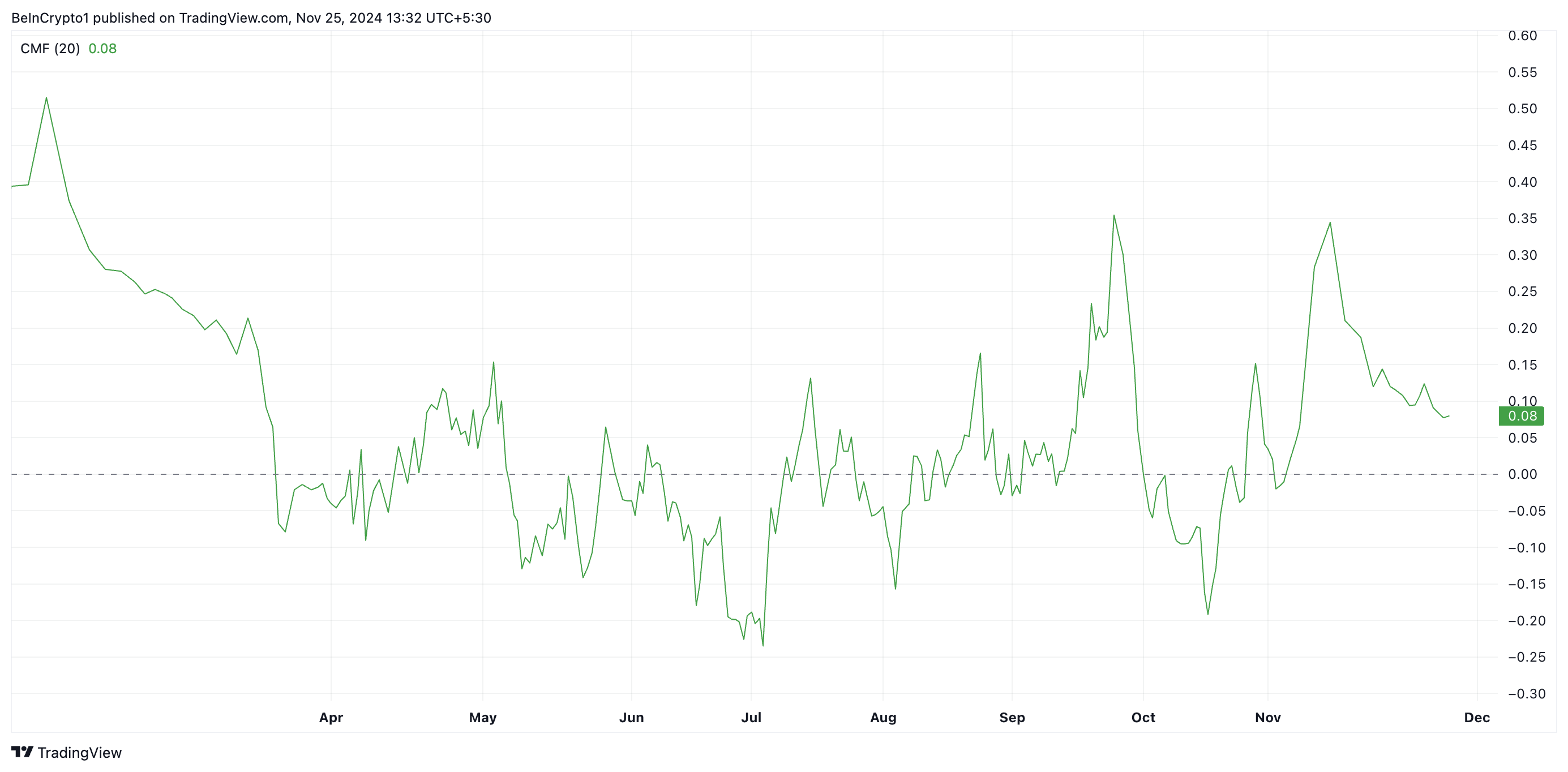 CMF mäter marknadens köp- och säljtryck. När den faller mot nollinjen signalerar det en försvagning av köpmomentumet, vilket indikerar att marknadsdeltagarna förlorar övertygelse om upptrenden.