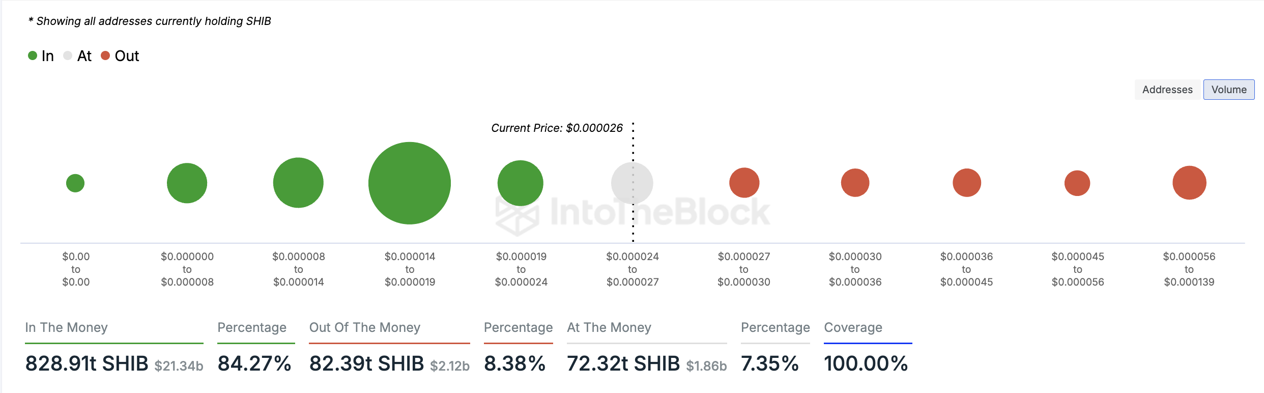 Å andra sidan är 82,39 biljoner SHIB-mynt som hålls av 398 000 adresser “ur pengarna”. Dessa är adresser som för närvarande håller sina mynt med förlust.