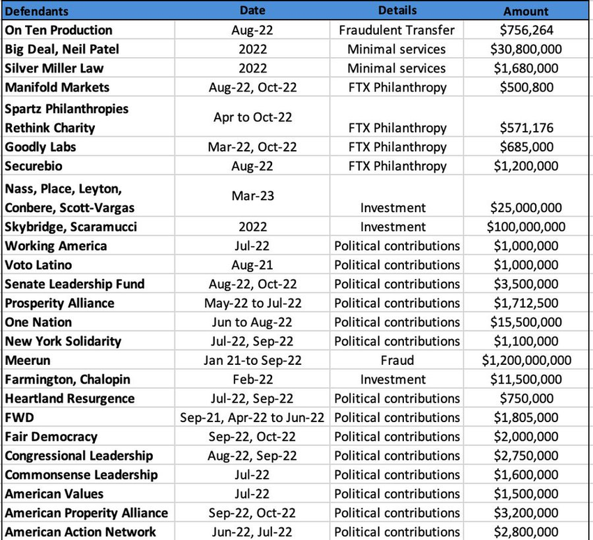 Förutom ideella organisationer, förföljer den misslyckade börsens juridiska team även andra framstående personer och enheter. Egendomen har stämt den tidigare kommunikationsdirektören i Vita huset, Anthony Scaramucci, och hans företag och söker skadestånd på över 100 miljoner USD. En annan stämning riktar sig mot teamet bakom Storybook Brawl, ett videospel som FTX:s medgrundare Sam Bankman-Fried investerade i och marknadsförde.