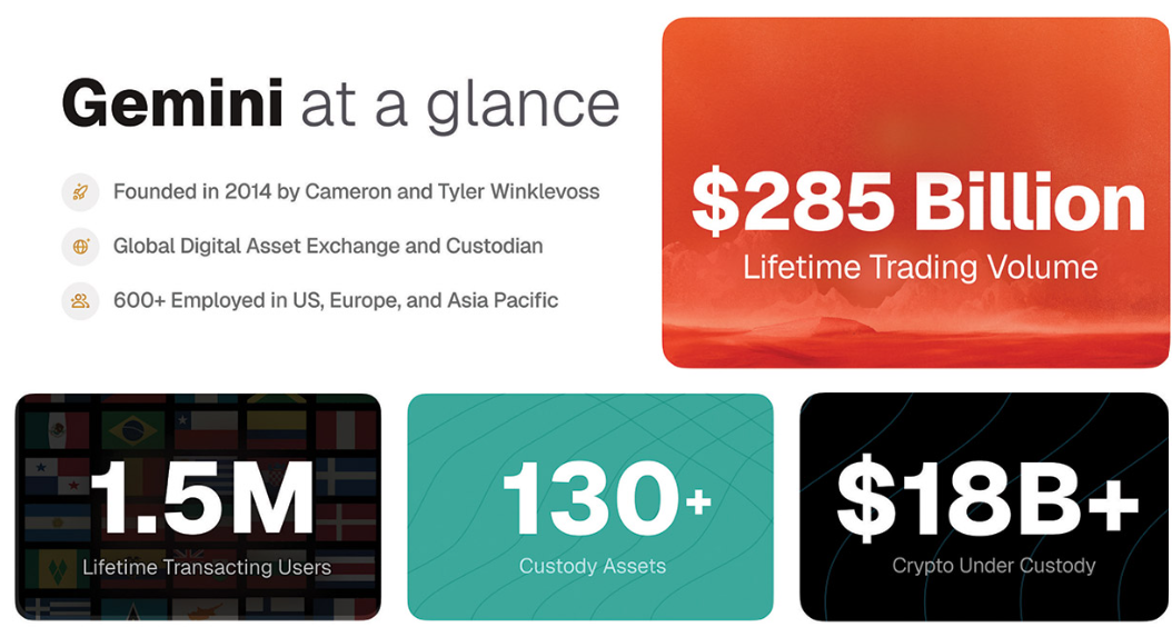 Gemini positionerar sig som en säker, användarvänlig plattform för handel och lagring av digitala tillgångar. Börsen rapporterar att den betjänar mer än 500 000 aktiva användare per månad och cirka 10 000 institutionella kunder i över 60 länder.
