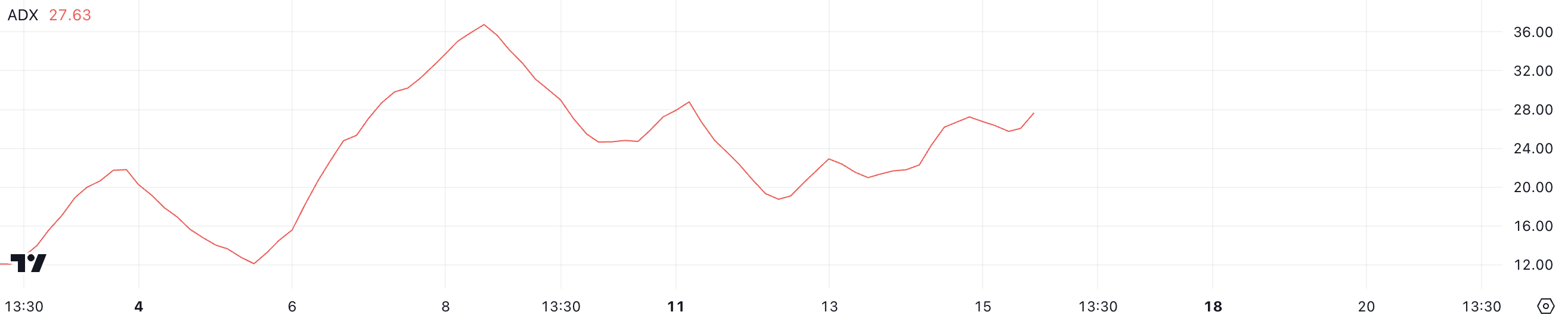 Det genomsnittliga riktningsindexet (ADX) mäter trendstyrka. Det varierar från 0 till 100, där värden över 25 indikerar en stark trend och under 20 tyder på ingen signifikant trend.