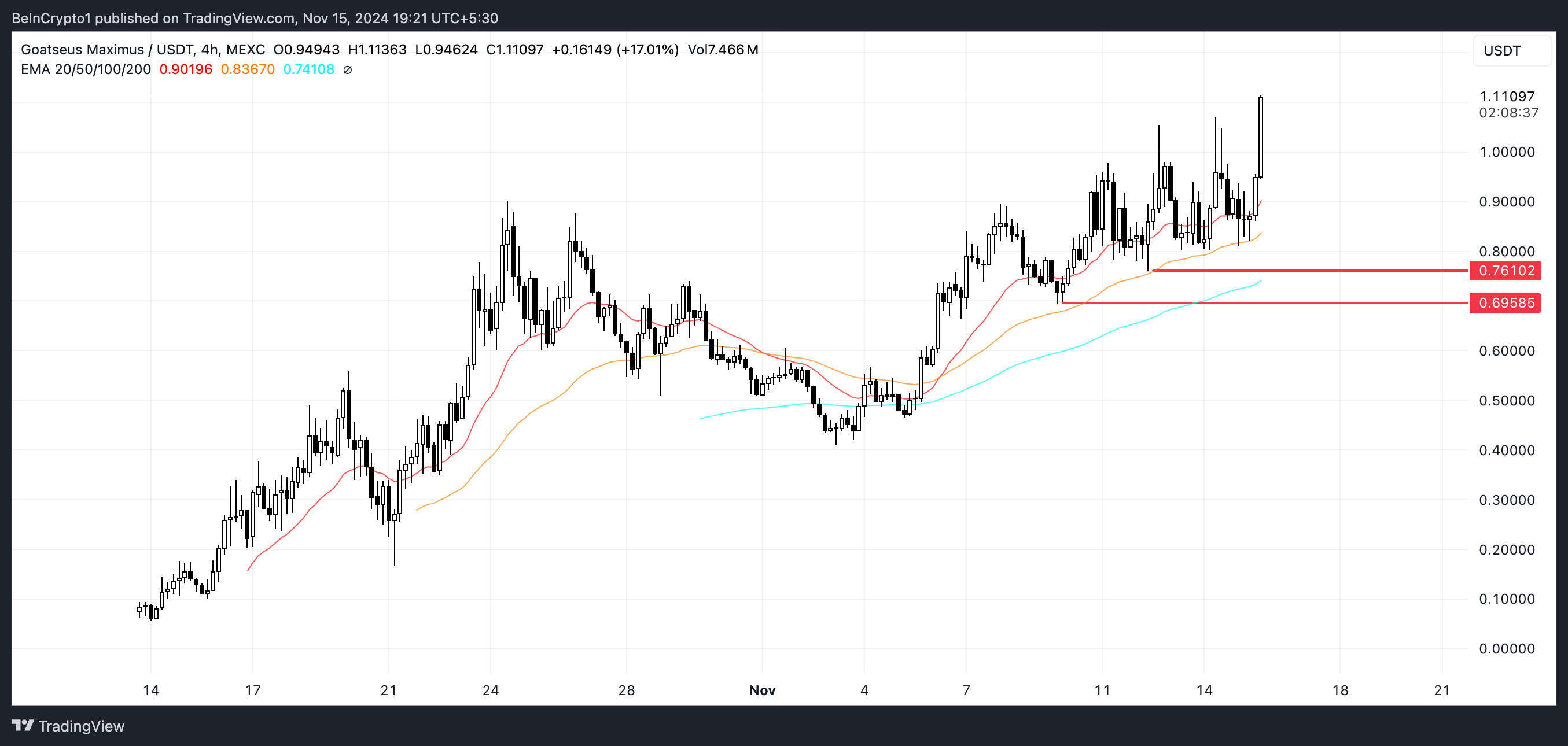 GOAT har nyligen nått sitt högsta pris någonsin, och dess EMA-linjer är mycket positiva.