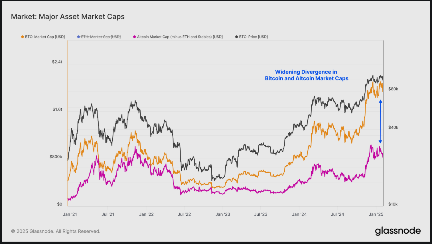 “Jämför marknadsvärden från 2022 års botten: Bitcoin växte från 363 miljarder USD till 1,93 biljoner USD (5,3x ökning). Samtidigt ökade altcoins (exklusive Ethereum och stablecoins) från 190 miljarder USD till 892 miljarder USD (4,7x ökning),” antydde rapporten.