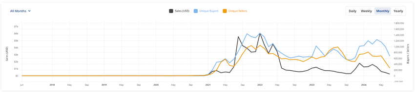 Trots dessa trender har NFT-marknaden sett en nedgång när det gäller försäljningsvolym. Data från CryptoSlam visar att den månatliga försäljningsvolymen för NFT har minskat sedan december 2023 från 1,77 miljarder dollar till 450,89 miljoner dollar i juni 2024.