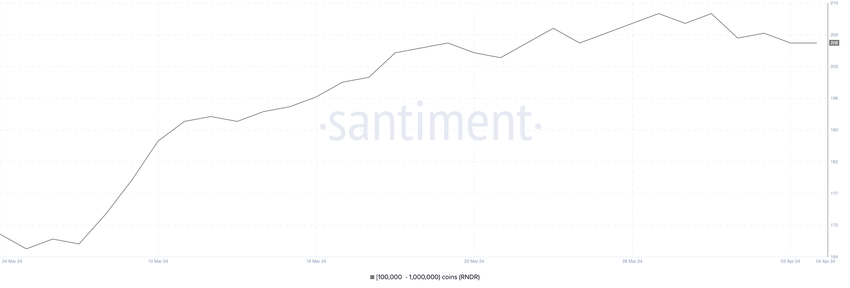 Trots den stigande MCA har expansionen i antalet adresser som innehar betydande RNDR-belopp planat ut under den senaste veckan. Denna förändring i valarnas beteende kan signalera en konsolideringsfas för Render Network, där marknaden når en balans mellan köp- och säljtryck.