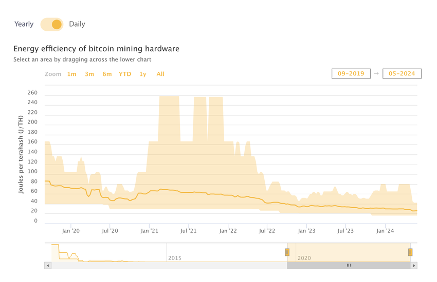 “Det bästa måttet på detta är Bitcoins effektivitetskvot, som mäter mängden Bitcoin som genereras per använd exahash. Ett bra sätt att tänka på detta är att Bitcoin är olja som hashrate är oljeborrtorn. Ju fler exahashes eller oljeborrtorn ett företag har, desto mer Bitcoin eller olja bör de generera”, sa Chang till BeInCrypto.