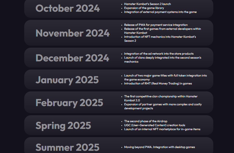 Med tillgänglig teknologi, erfarenhet, branschutvecklare och spelare siktar Hamster Kombat på att skapa en Web3-spelplattform. Enligt färdplanen kommer den att inkludera externa betalningssystem, lansera nya spel och integrera NFT som spelobjekt på plattformen före årets slut.