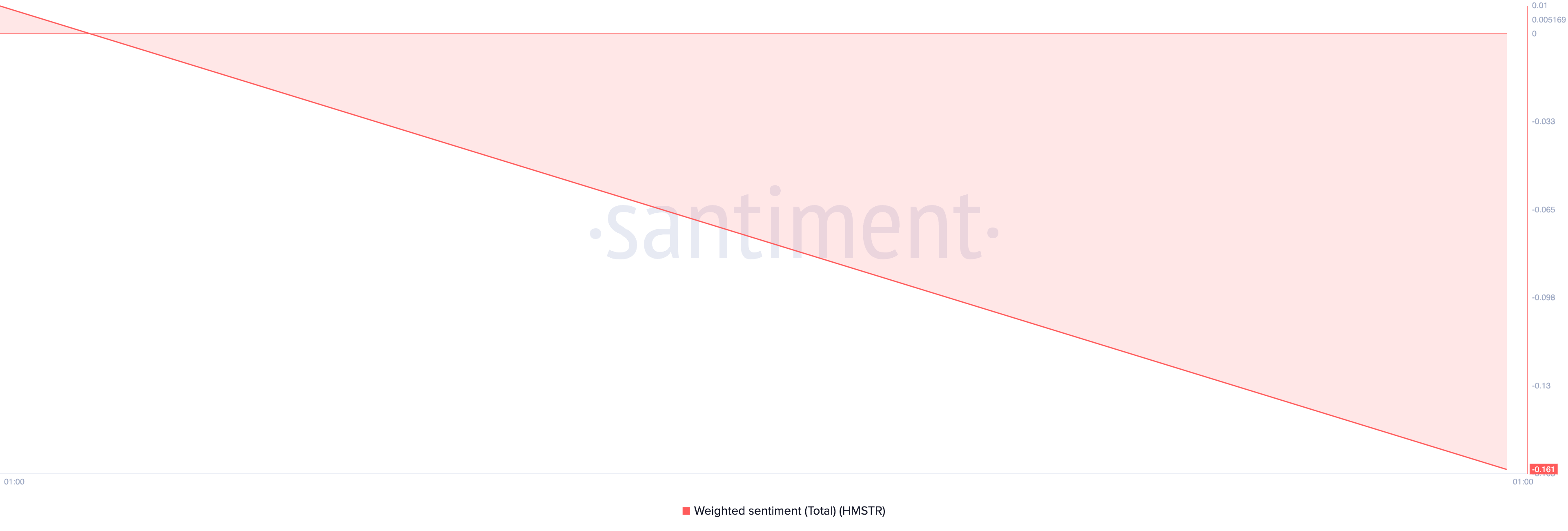 Sedan airdropen har HMSTR haft en negativ tendens, vilket återspeglas i dess negativa viktade sentiment, för närvarande på -0,16. Detta mått spårar den övergripande marknadsstämningen, och ett negativt sentiment tyder på att de flesta diskussioner på sociala medier drivs av rädsla, osäkerhet och tvivel – ofta en föraning om en långvarig nedåtgående trend.