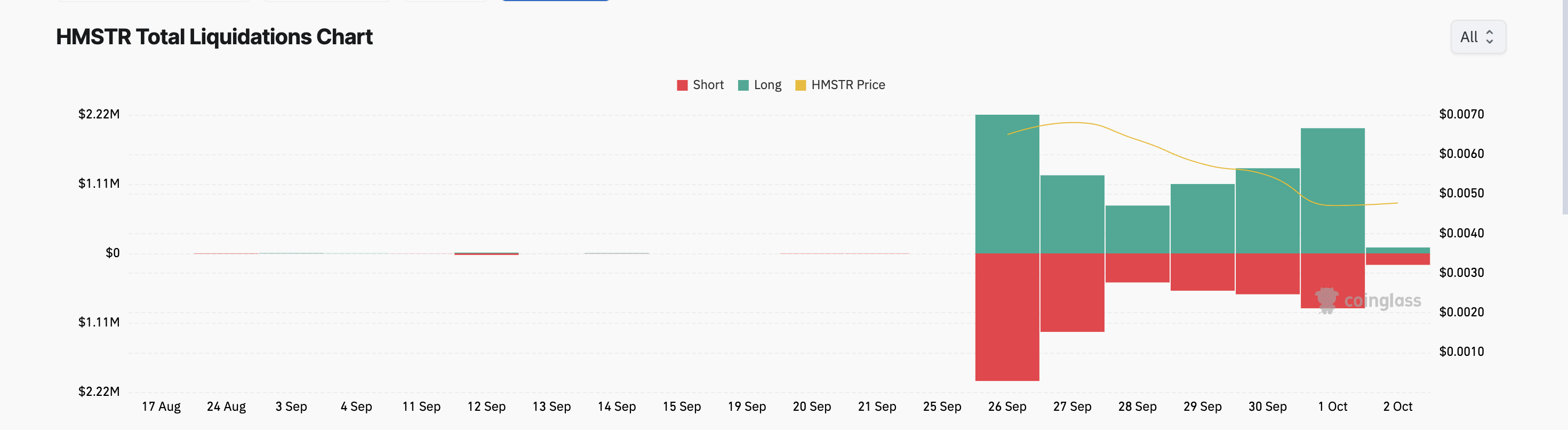 Men många av dessa långa positioner har inte varit lönsamma, eftersom likvideringar fortsätter. Sedan den 26 september har 9 miljoner USD värda HMSTR långa positioner likviderats på grund av tokenets pågående prisfall.