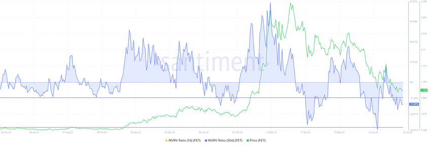 MVRV-talet mäter investerarnas vinst/förlust. Fetch.ai:s 30-dagars MVRV på -15% signalerar förluster, vilket kan leda till köp. Historiskt sett föregår FET MVRV mellan -10 % och -32 % MVRV ofta rallyn, vilket betecknar en möjlighetszon för ackumulering.