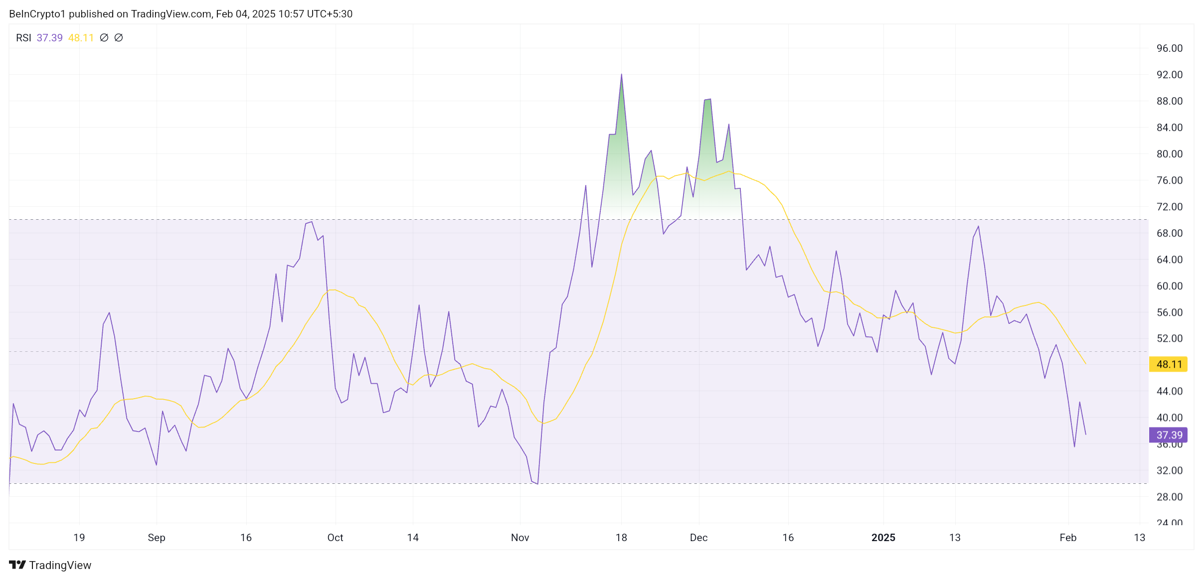 Ur ett tekniskt perspektiv visar HBAR:s makromomentum en förstärkning av den negativa trenden. Relative Strength Index (RSI) har sjunkit till en tre månaders lägsta nivå, senast sedd i november 2024. Den ligger nu under den neutrala nivån 50,0, vilket visar på ökat nedåttryck.