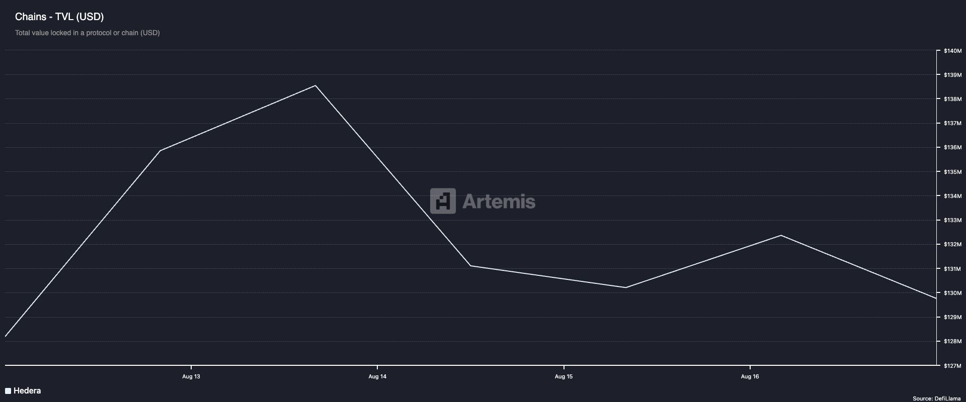 Under de senaste dagarna har användaraktiviteten på Hedera-nätverket minskat, vilket märks genom en nedgång i dess totala värde låst (TVL). Enligt Artemis data ligger detta nu på 129 miljoner USD, ned 5 % sedan den 14 augusti.