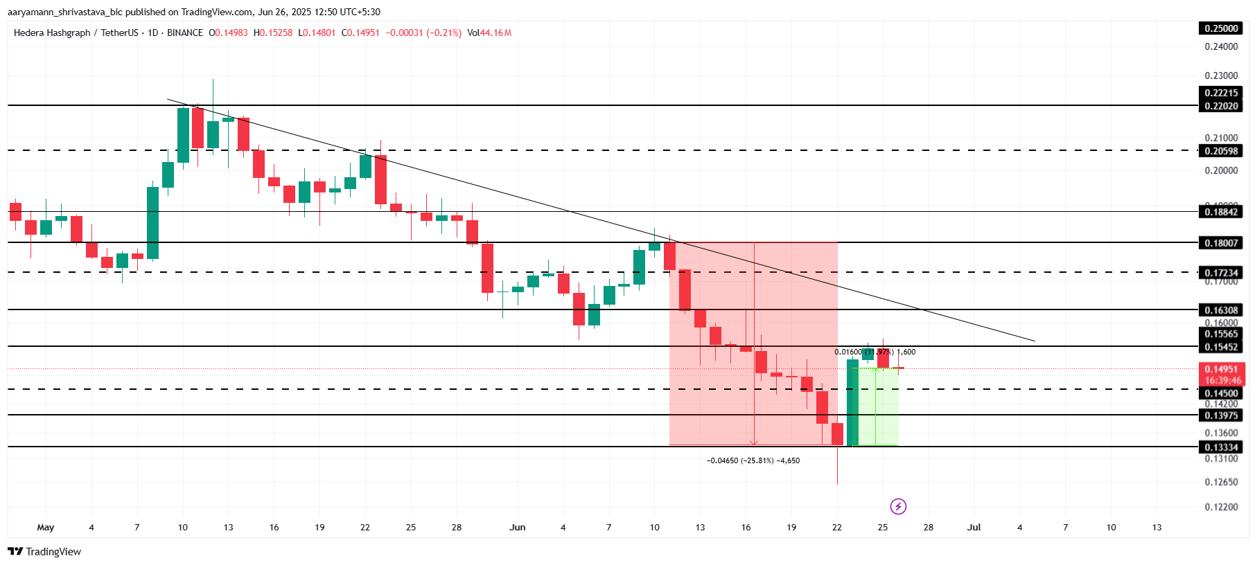 Om den positiva trenden fortsätter, kan HBAR bryta 0,154 USD och vända till stöd. En lyckad ökning över denna nivå skulle bana väg för en uppgång mot 0,163 USD. Att bryta detta motstånd skulle ogiltigförklara den nuvarande nedåtgående trenden och återhämta en del av de 25,8 % förlusterna som drabbades tidigare i månaden, vilket signalerar en potentiell vändning för HBAR.
