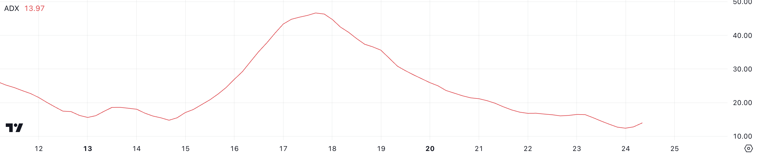 Vid 13,97 ligger HBAR ADX under 20-gränsen, vilket indikerar att den nya uppåtgående trenden fortfarande är i ett tidigt skede och saknar betydande styrka.