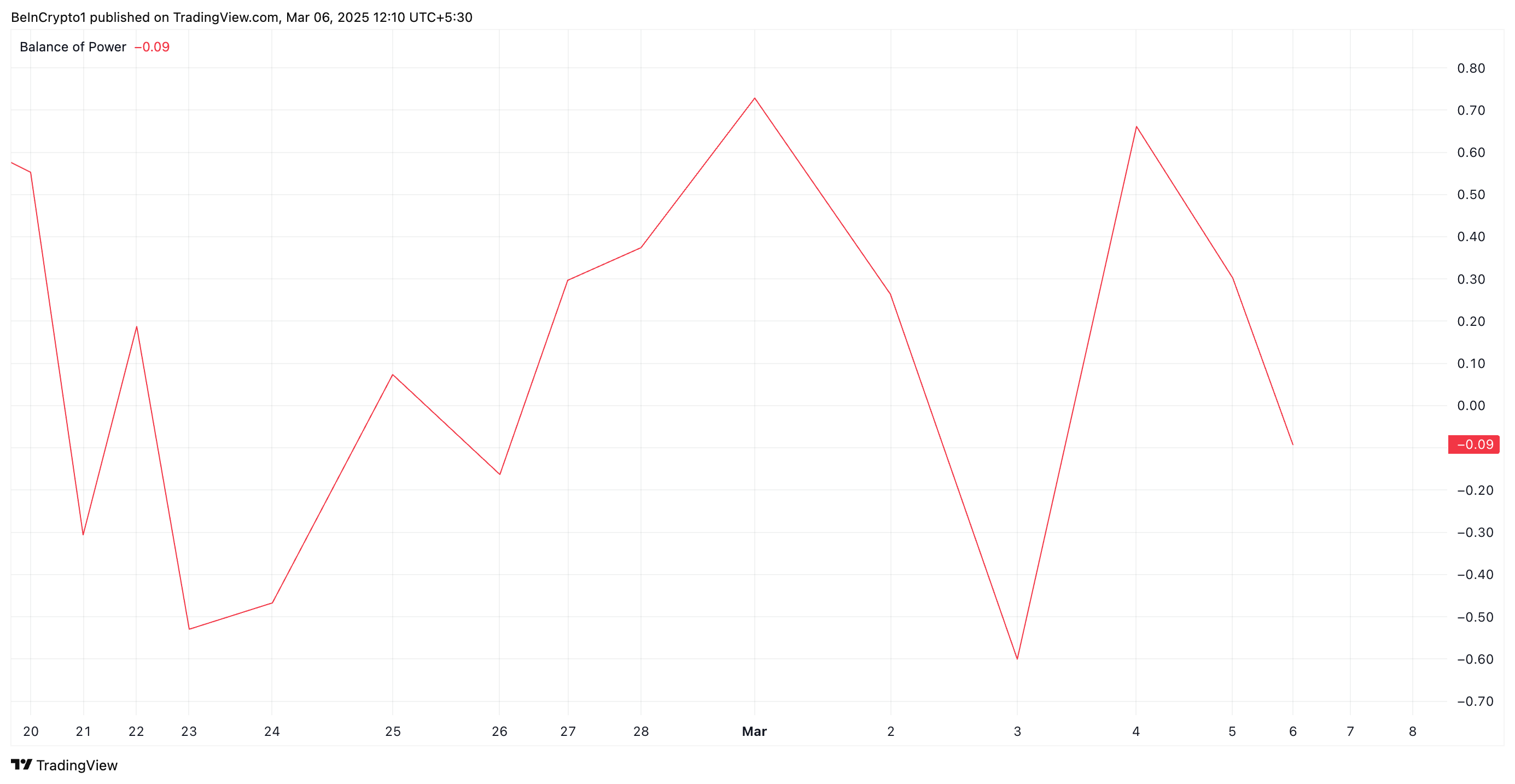 HBAR:s negativa Balance of Power (BoP) visar på försvagad köpkraft bland dess spotmarknadsdeltagare. Vid pressens tidpunkt är denna indikator, som jämför styrkan hos en tillgångs köpare och säljare, under noll på -0,09.