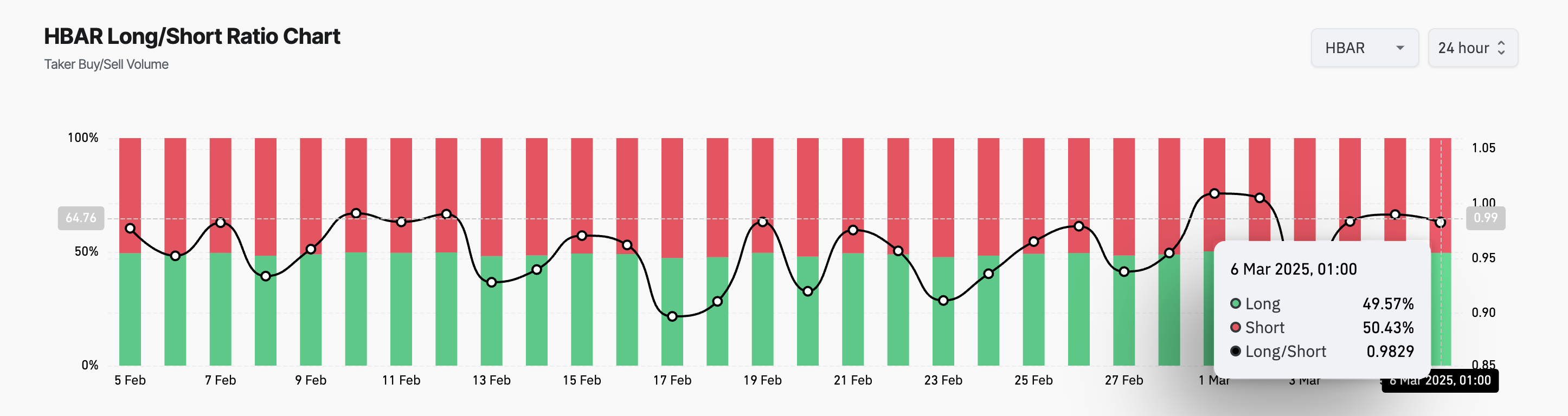 Long/Short-förhållandet mäter andelen långa positioner (satsningar på prisökningar) mot korta positioner (satsningar på prisnedgångar) på marknaden. När förhållandet är under 1, indikerar det att korta positioner är fler än långa positioner. Det belyser den negativa känslan bland HBAR-innehavare och ökar nedåttrycket på dess pris.