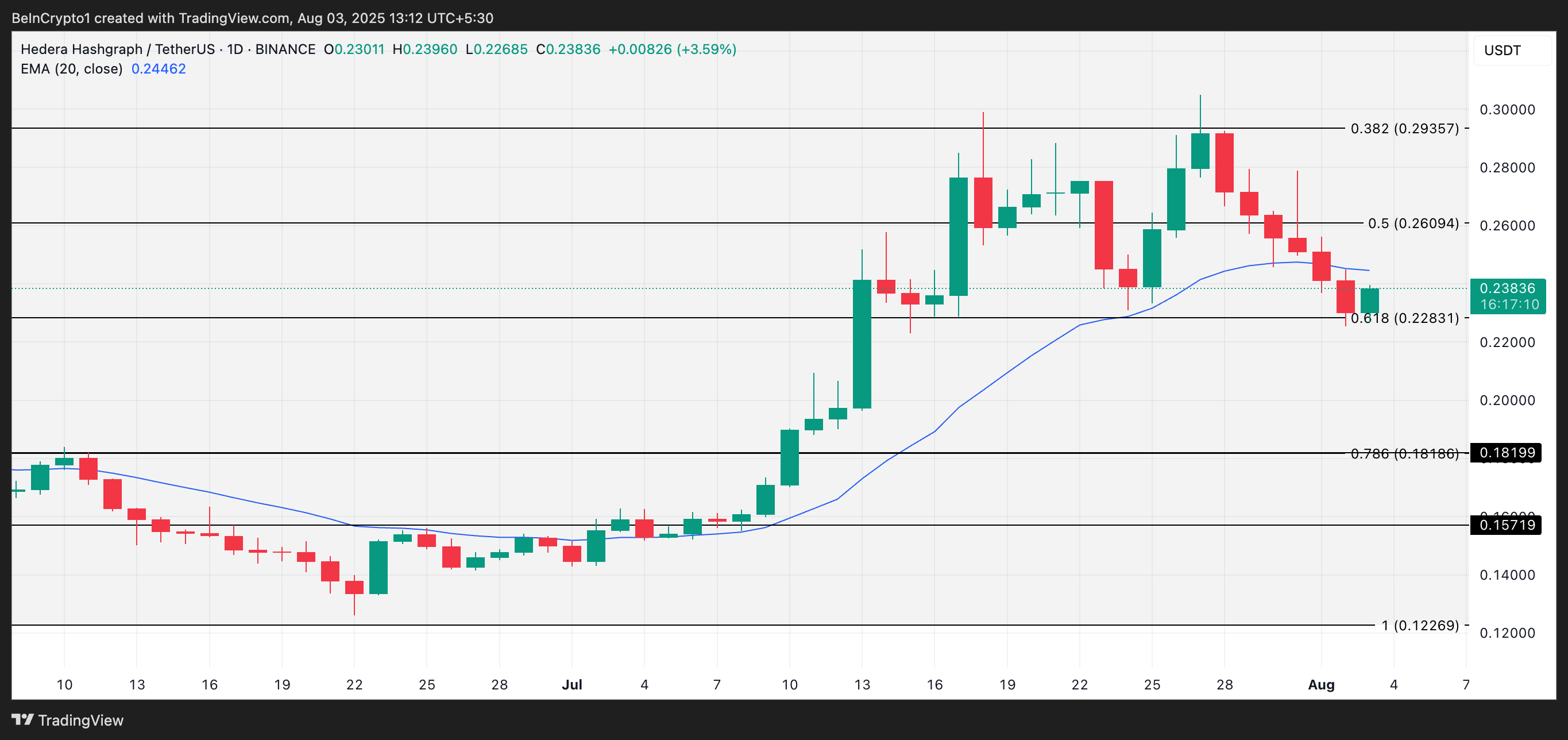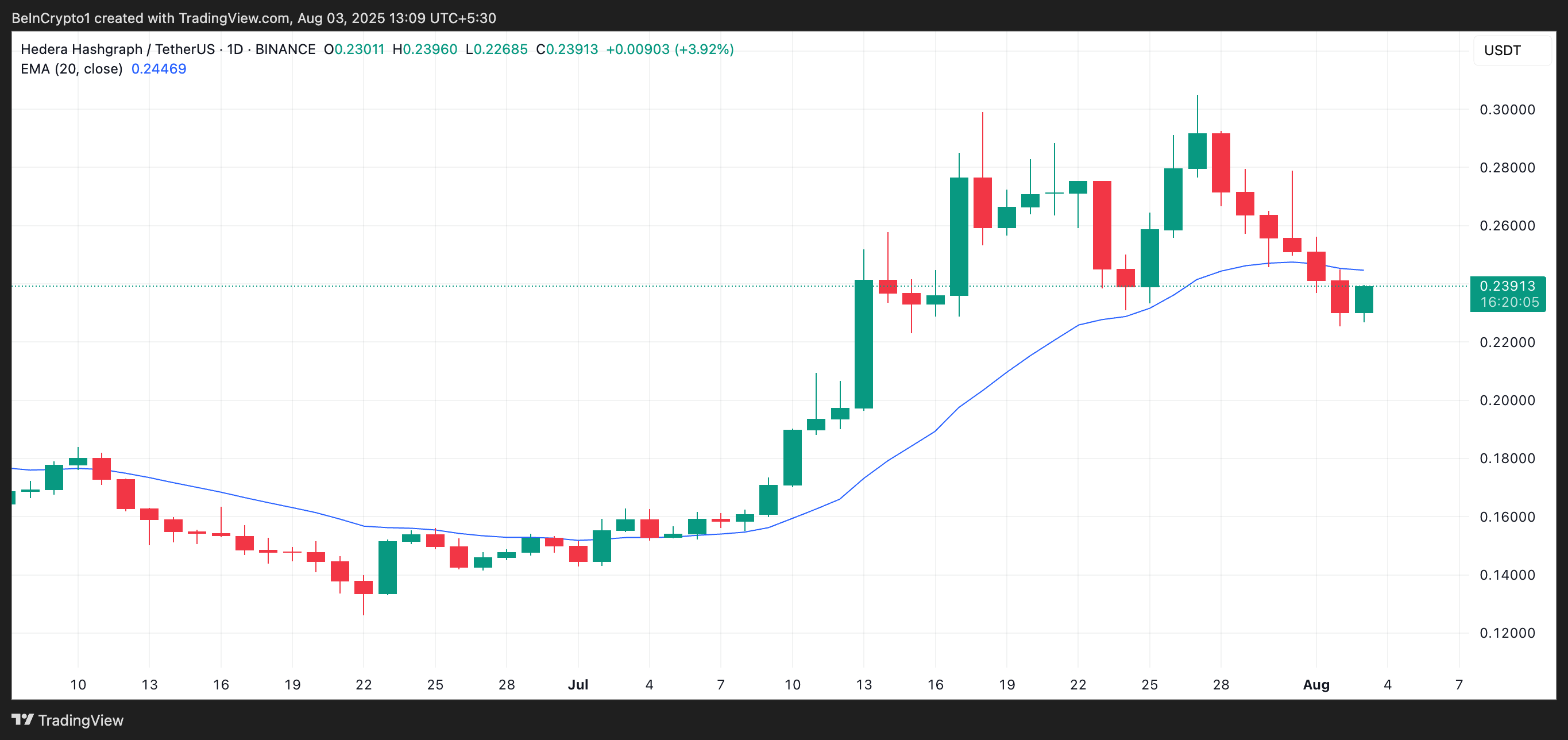 Avläsningar från endagsdiagrammet visar att HBAR:s tvåsiffriga nedgång har tryckt priset under det 20-dagars exponentiella glidande medelvärdet (EMA).