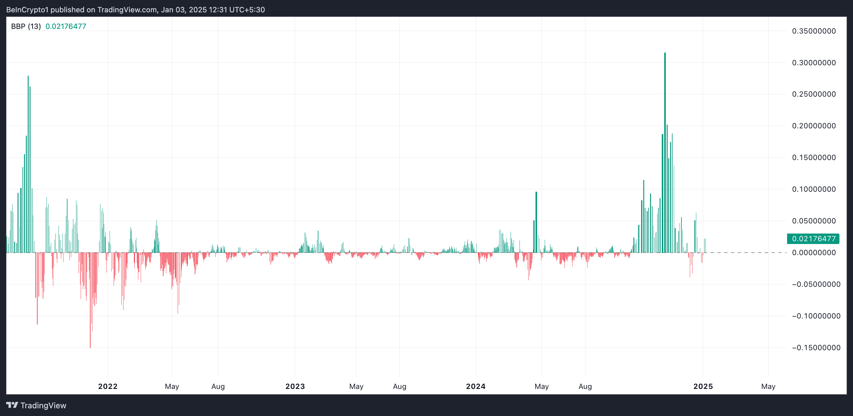 Elder-Ray Index mäter styrkan hos en tillgångs köpare (bulls) och säljare (bears). Som med HBAR, när dess värde är positivt, indikerar det att köparna dominerar, vilket tyder på uppåtgående prisrörelse och en potentiell köpmöjlighet.