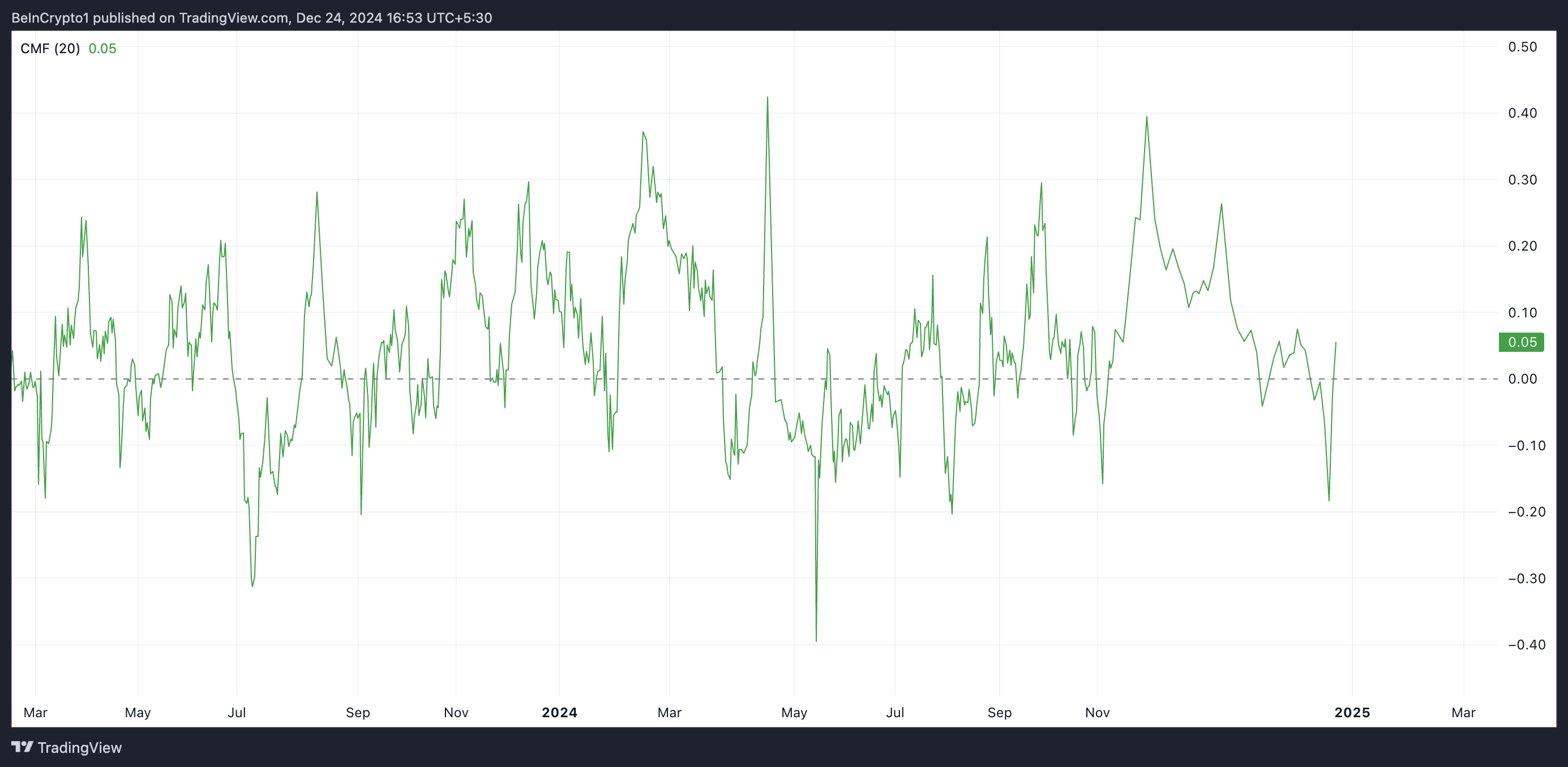 Vidare antyder HBAR:s stigande Chaikin Money Flow (CMF) en sannolikhet för en fortsatt uppgång. Vid pressen är detta vid 0,05.