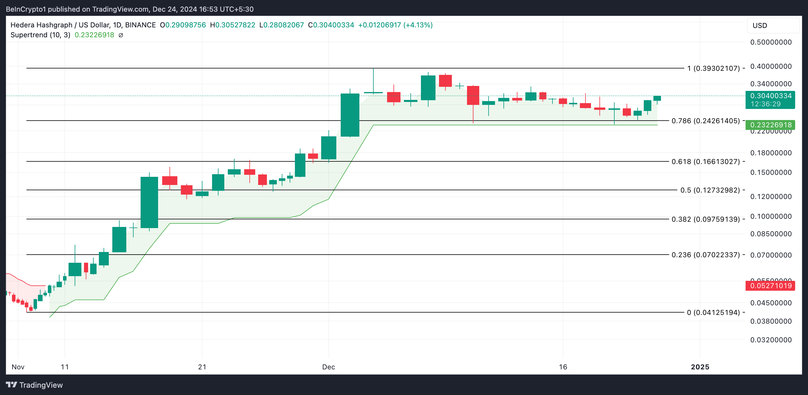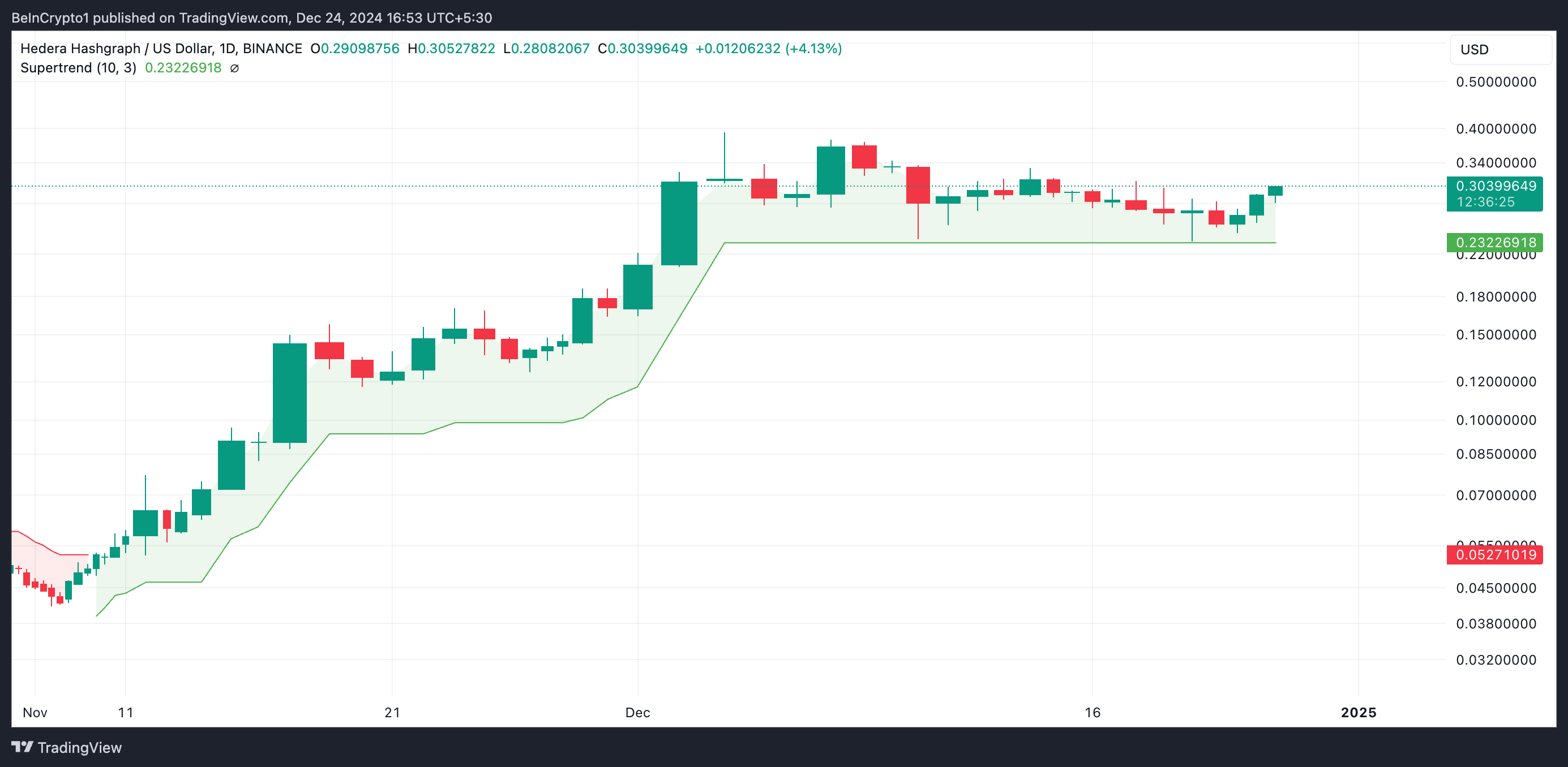 Avläsningar från HBAR:s dagliga diagram visar att trots sin senaste nedgång har priset hållit sig över Super Trend-indikatorn, som fortsätter att erbjuda dynamiskt stöd vid 0,23 USD.