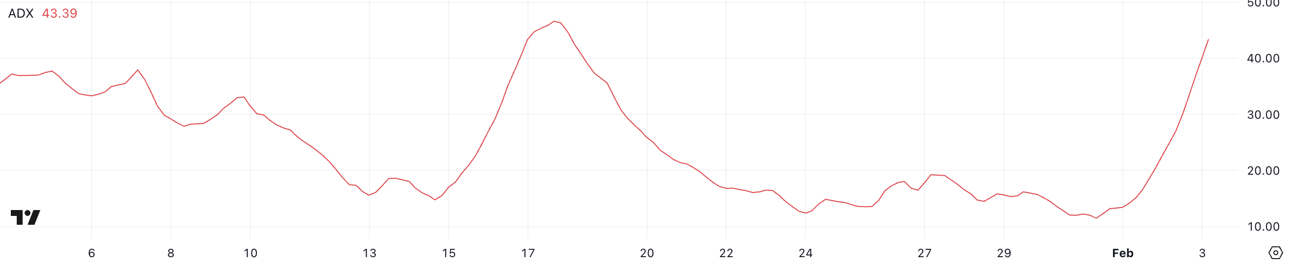 Hedera Average Directional Index (ADX) är för närvarande på 43,3, en kraftig ökning från 11,4 för bara tre dagar sedan. Denna betydande ökning tyder på att styrkan i HBAR:s nuvarande trend intensifieras.