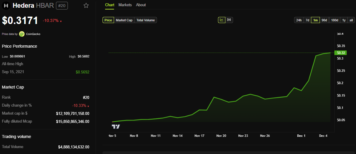 Trots denna nyhet har Hedera Hashgraphs HBAR-token sjunkit med hela 10 %. Enligt BeInCrypto data handlades HBAR för 0,3171 USD vid skrivande stund.