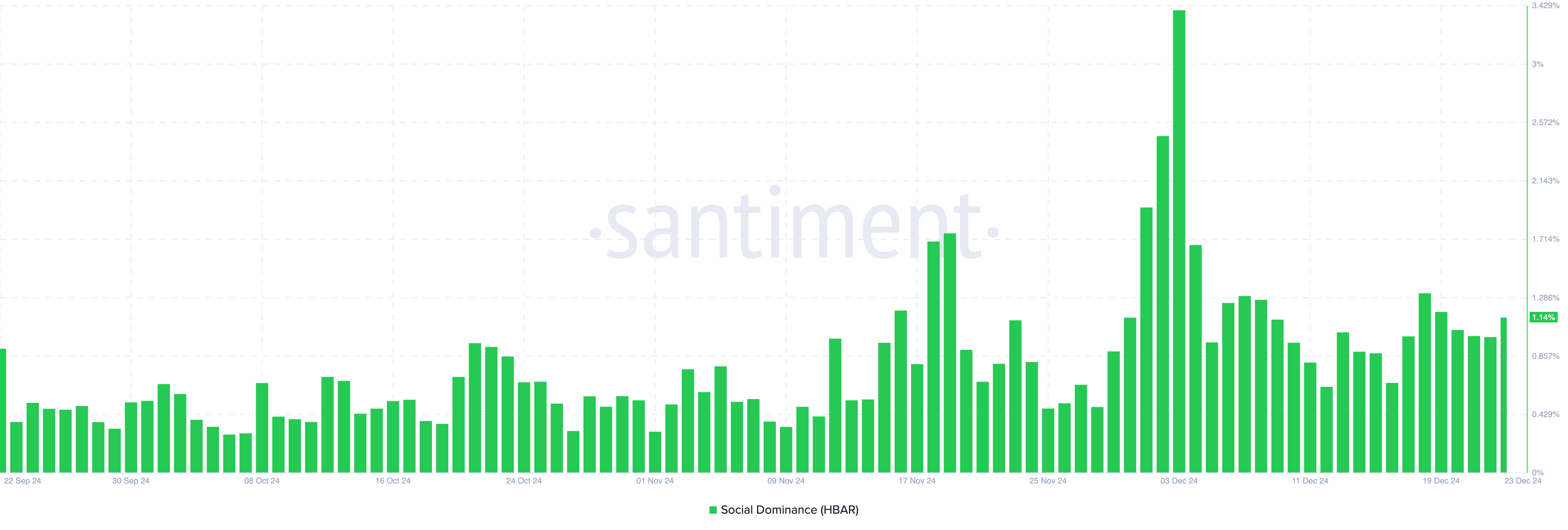 Vidare visar on-chain data från Santiment en ökning i HBAR:s sociala dominans, som når 1,14 %. Denna mätning spårar nivån av diskussioner kring en kryptovaluta jämfört med andra i topp 100.