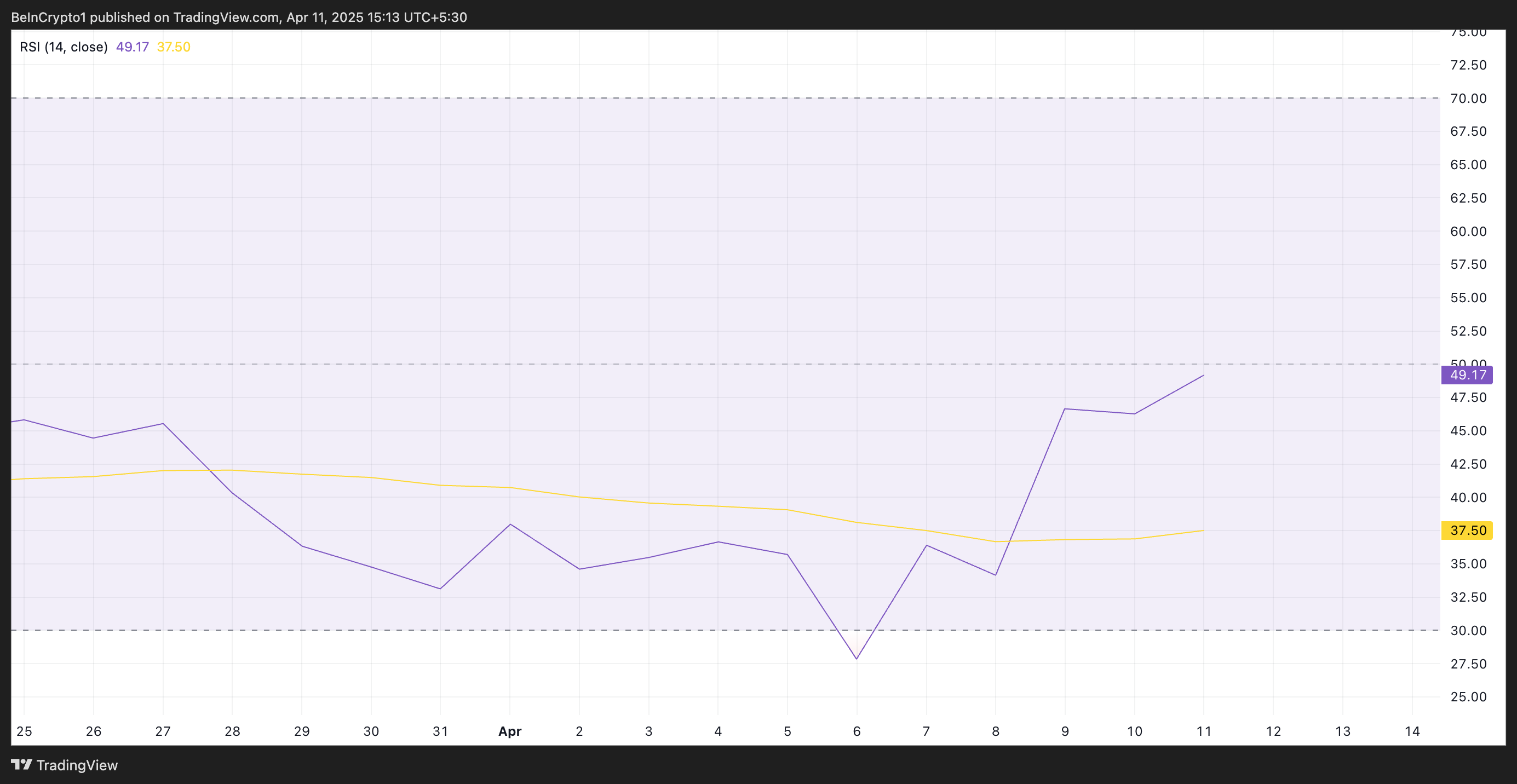 RSI-indikatorn mäter en tillgångs överköpta och översålda marknadsförhållanden. Den varierar mellan 0 och 100. Värden över 70 tyder på att tillgången är överköpt och kan sjunka i pris, medan värden under 30 indikerar att tillgången är översåld och kan återhämta sig.