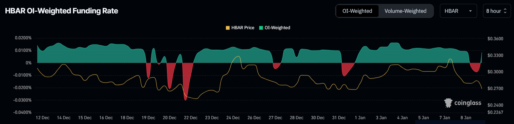 Finansieringsräntan för HBAR har varierat mellan positiv och negativ, vilket speglar handlares osäkerhet om prisriktningen. Handlare positionerar sig för att tjäna på antingen ett potentiellt utbrott eller en ytterligare nedgång. Denna dragkamp har hållit finansieringsräntan i förändring, vilket belyser den delade känslan på marknaden.