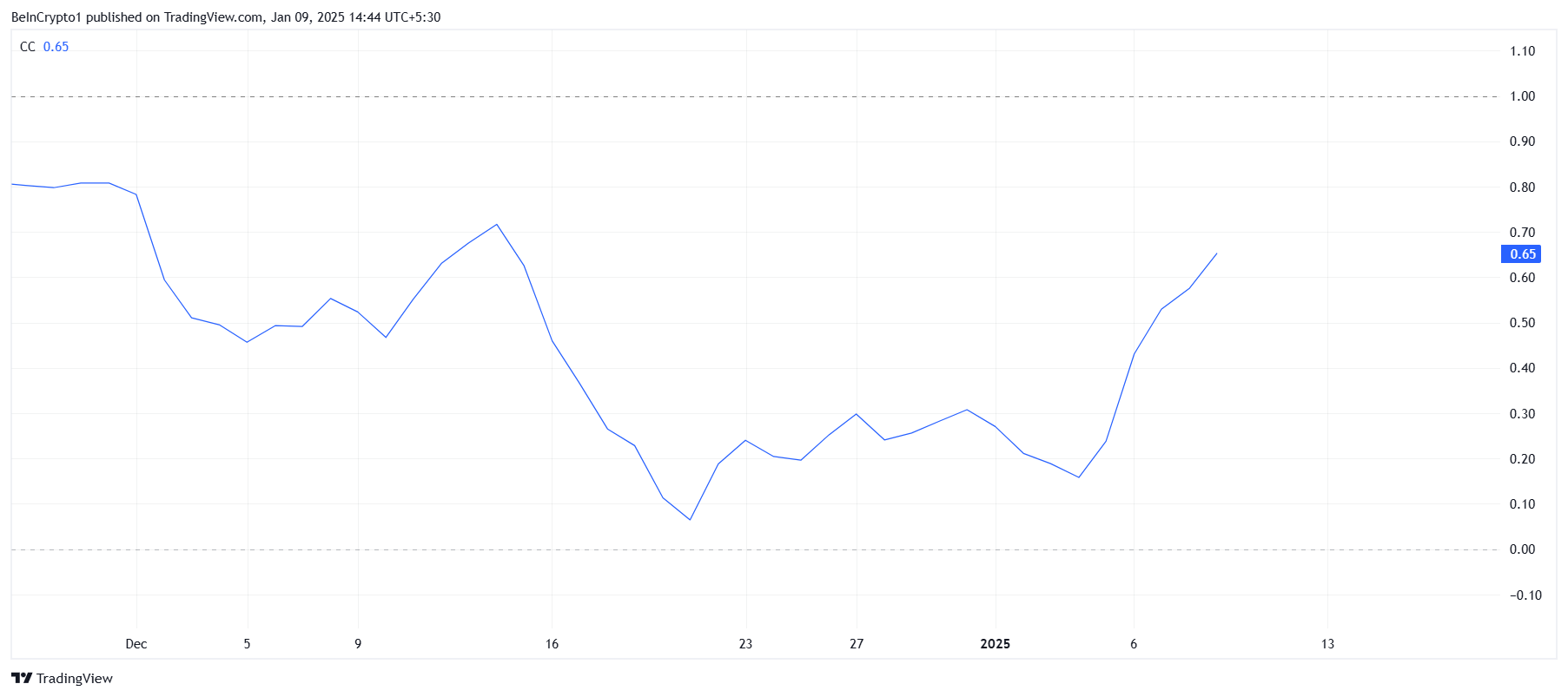 HBAR:s makro-momentum är starkt kopplat till dess korrelation med Bitcoin, som för närvarande är 0,65. Denna ökande korrelation tyder på att HBAR kan följa Bitcoins prisrörelser närmare. Om Bitcoin återtar nivån 100 000 USD och fortsätter att stiga, kan det ge det momentum som behövs för att HBAR ska bryta ut ur sin konsolideringsfas.