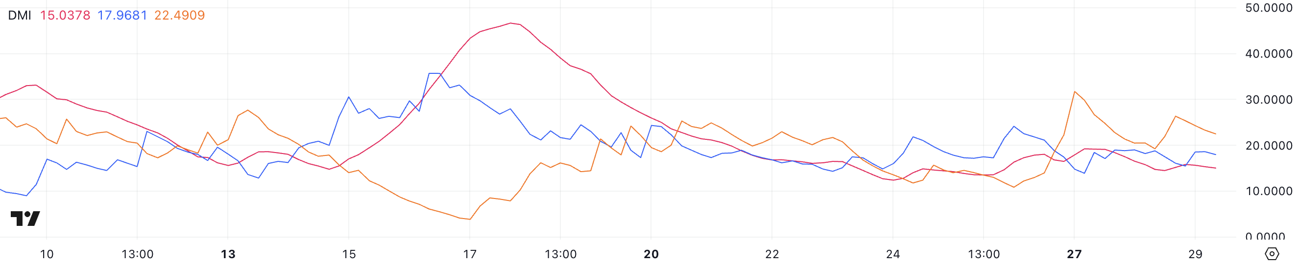 Hedera DMI-diagram visar att ADX ligger på 15, och har varierat mellan 12 och 20 de senaste åtta dagarna, vilket indikerar svag trendstyrka.