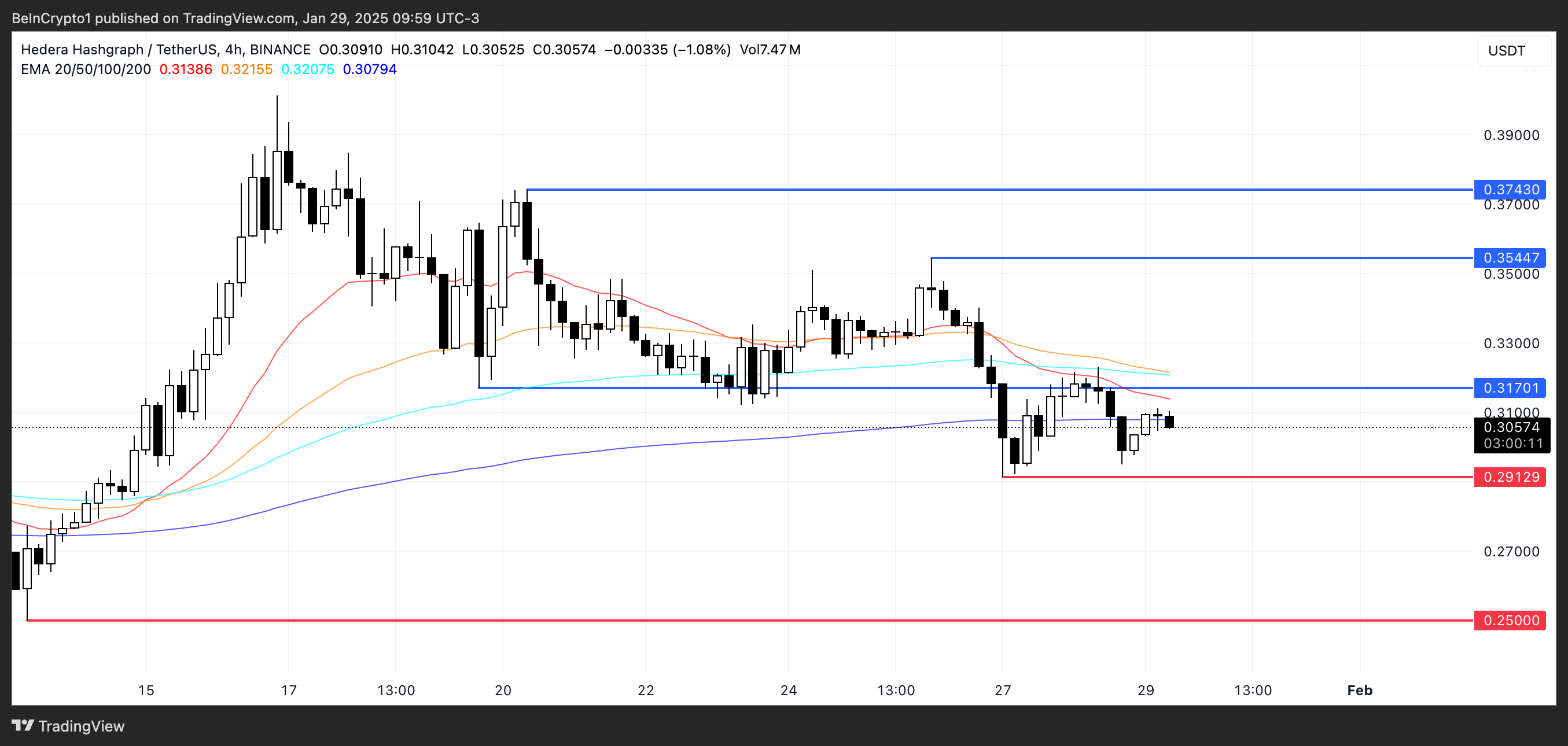 Å andra sidan, om HBAR vänder sin trend, kan ett gyllene kors uppstå, vilket signalerar positiv styrka. Ett genombrott över 0,31 USD motståndsnivån kan öppna dörren för en uppgång mot 0,35 USD och till och med 0,37 USD, vilket innebär en möjlig vinst på 23%.