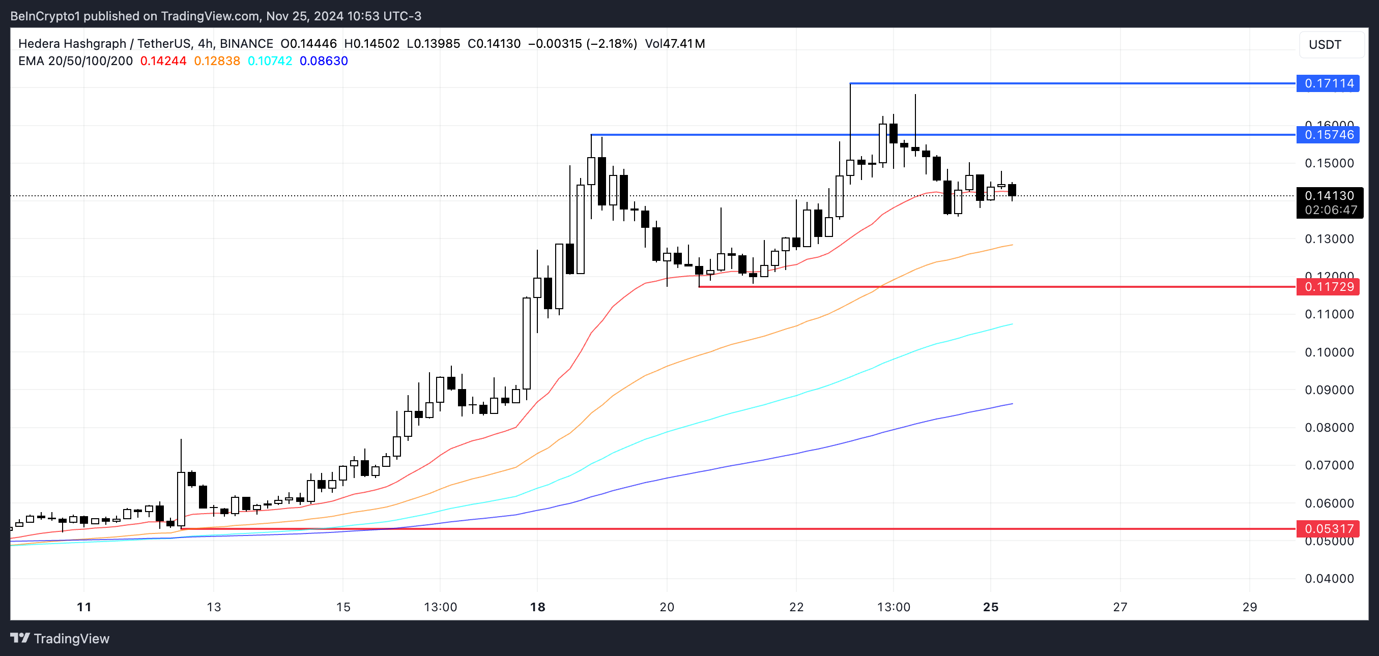 HBAR EMA-linjer visar en positiv trend, med kortsiktiga linjer över de långsiktiga, vilket signalerar starkt uppåtgående momentum.