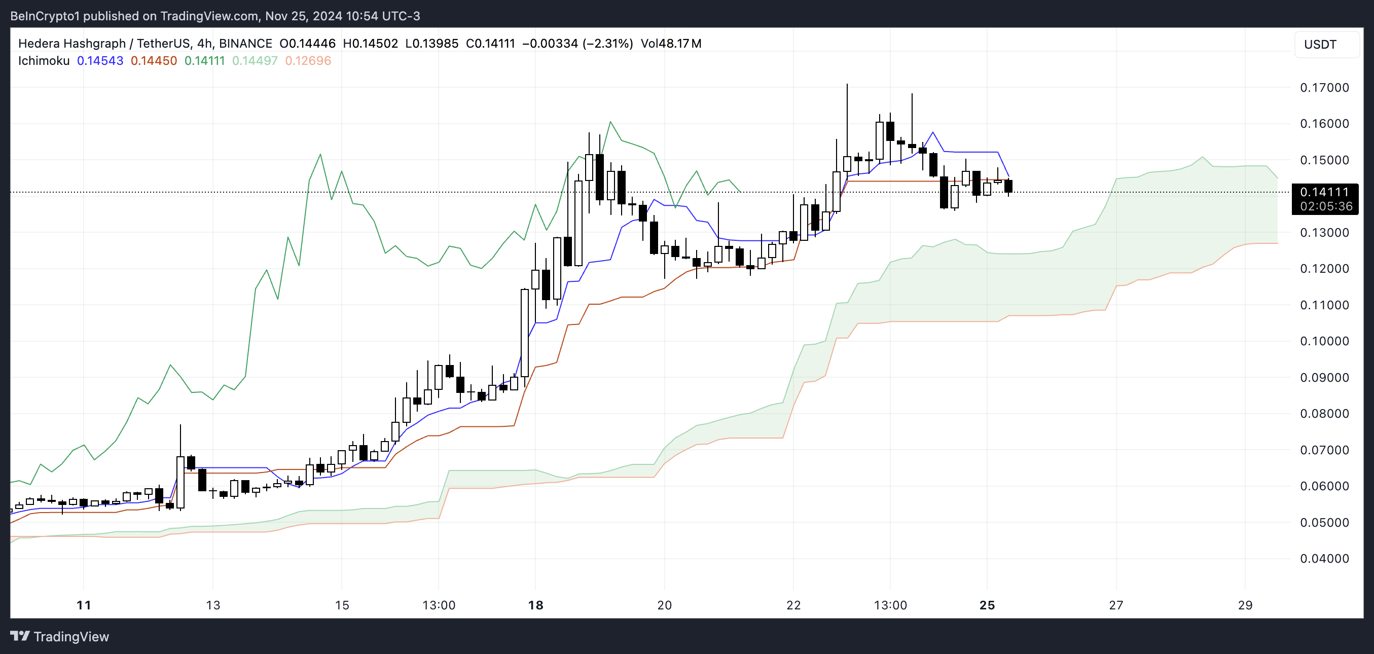Om HBAR-priset håller sig över molnet kan det försöka en positiv vändning. Nästa motstånd kommer att vara runt Tenkan-Sen och den senaste toppen.