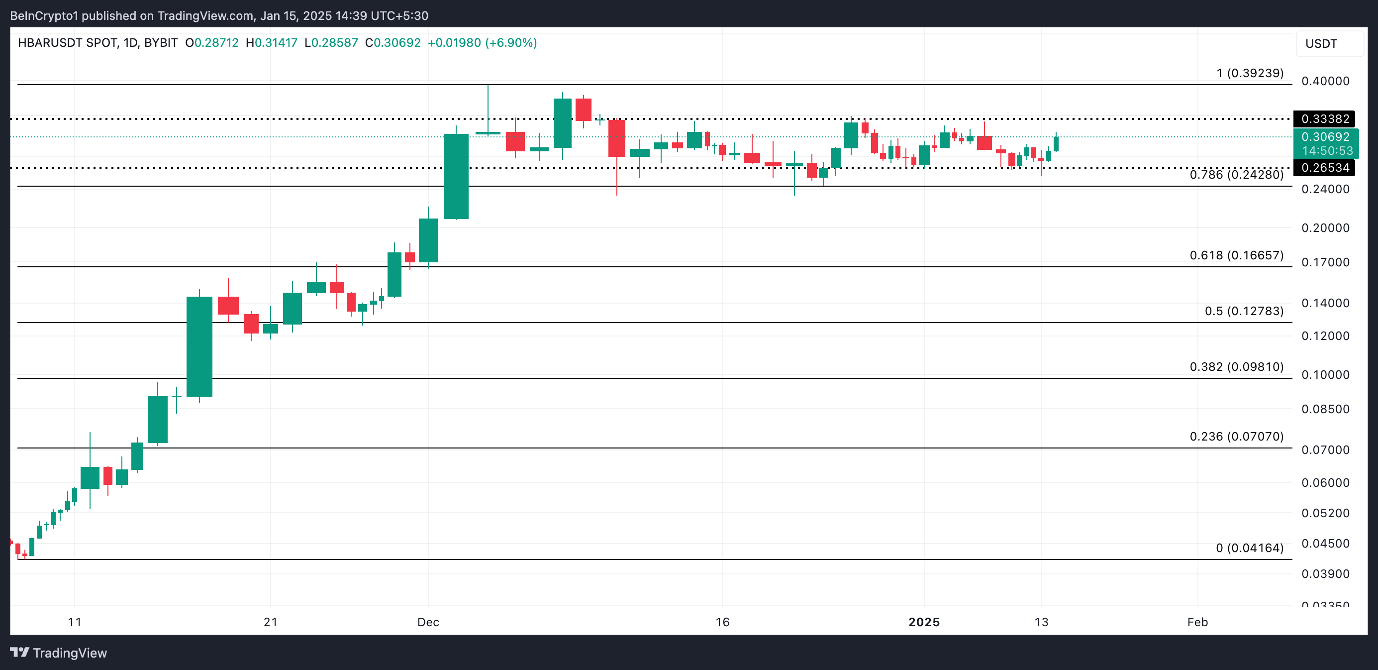 HBAR:s pris har hållit sig inom ett intervall den senaste månaden. Det har mött motstånd vid 0,33 USD och funnit stöd vid 0,26 USD. Med den stärkta positiva inställningen till altcoinet kan det bryta över motståndet vid 0,33 USD och stiga mot 0,39 USD.