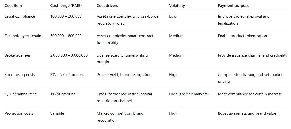 Mäklaravgifter tar den största delen, medan blockkedjeintegration och juridisk efterlevnad lägger till ytterligare kostnader. Ytterligare avgifter för kapitalanskaffning, gränsöverskridande godkännanden och marknadsföring ökar den totala bördan.