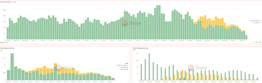 Enligt data från Dune förblir Solanas Pump.fun motståndskraftig trots ökad konkurrens från Trons SunPump. På nyckelintäktsmått fortsätter Pump.fun att leda, överstigande 100 miljoner USD i totala intäkter. Under de senaste 24 timmarna ensamt genererade Pump.fun 278 914 USD, jämfört med SunPumps 36 139 USD.