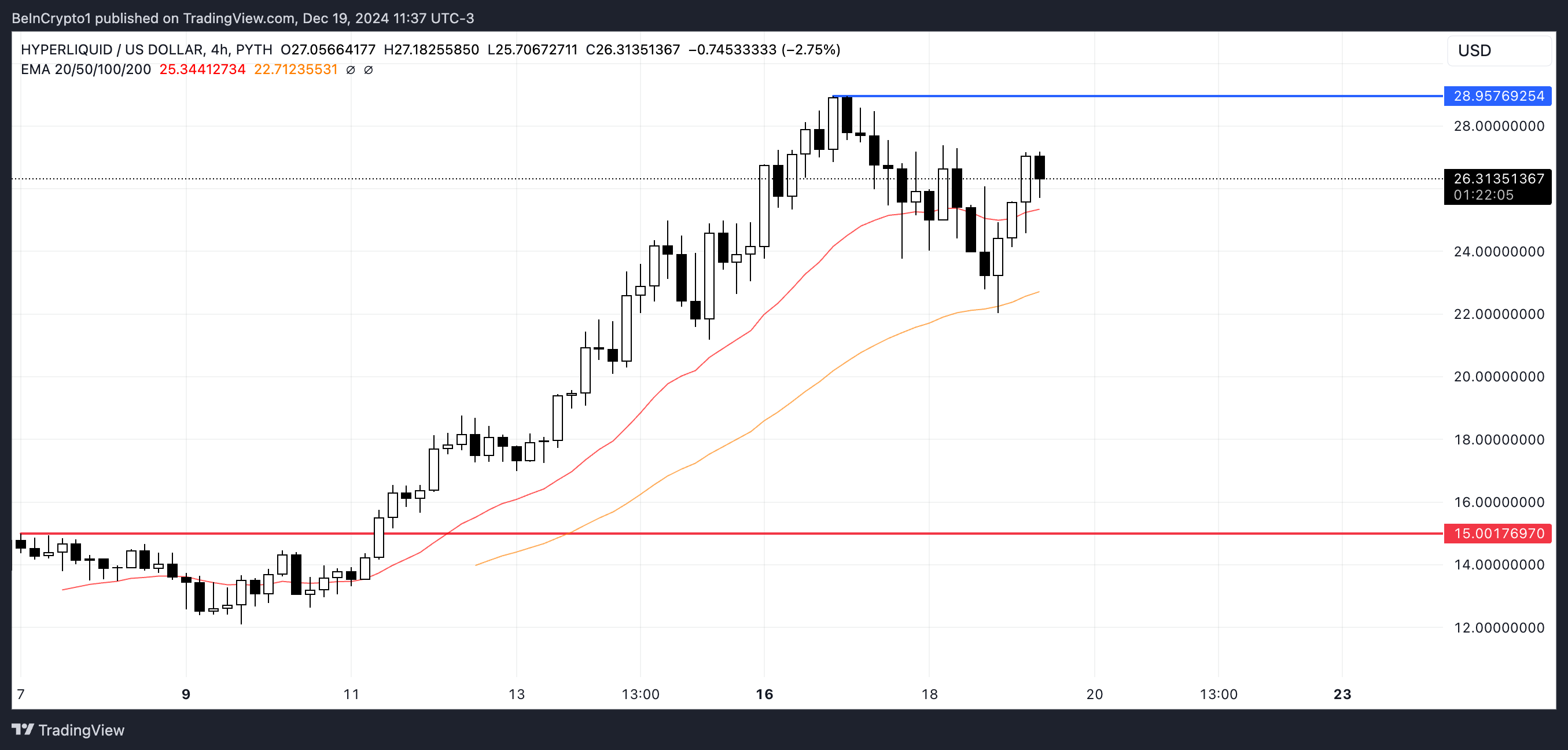 Om den positiva trenden fortsätter kan HYPE nå en ny rekordnivå nära 28,95 USD och eventuellt stiga till 30 USD eller 35 USD. Men en försvagning kan leda till en korrigering, med starkt stöd vid 15 USD, vilket innebär en potentiell nedgång på 42 %.