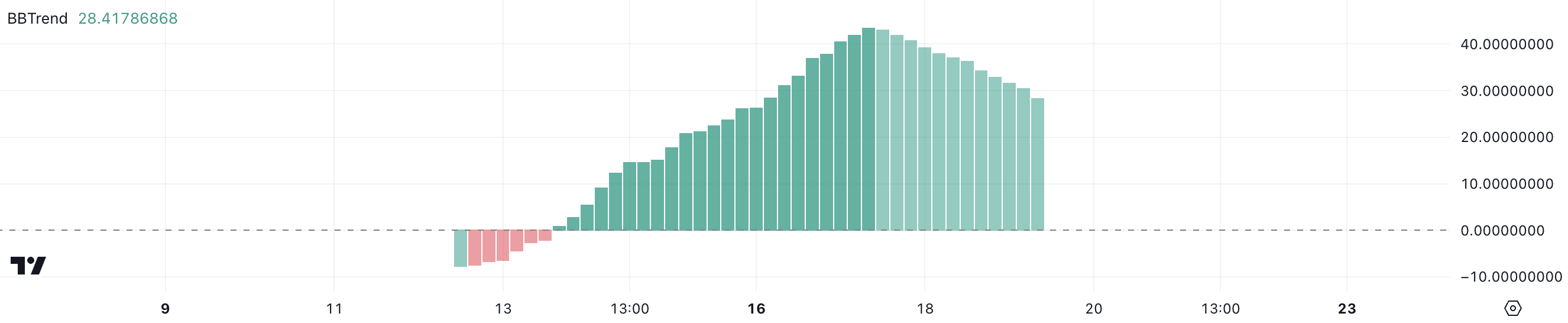 BBTrend, härledd från Bollinger Bands, mäter styrkan och riktningen av en pristrend. En positiv BBTrend speglar positiv momentum, medan ett negativt värde indikerar negativt tryck.