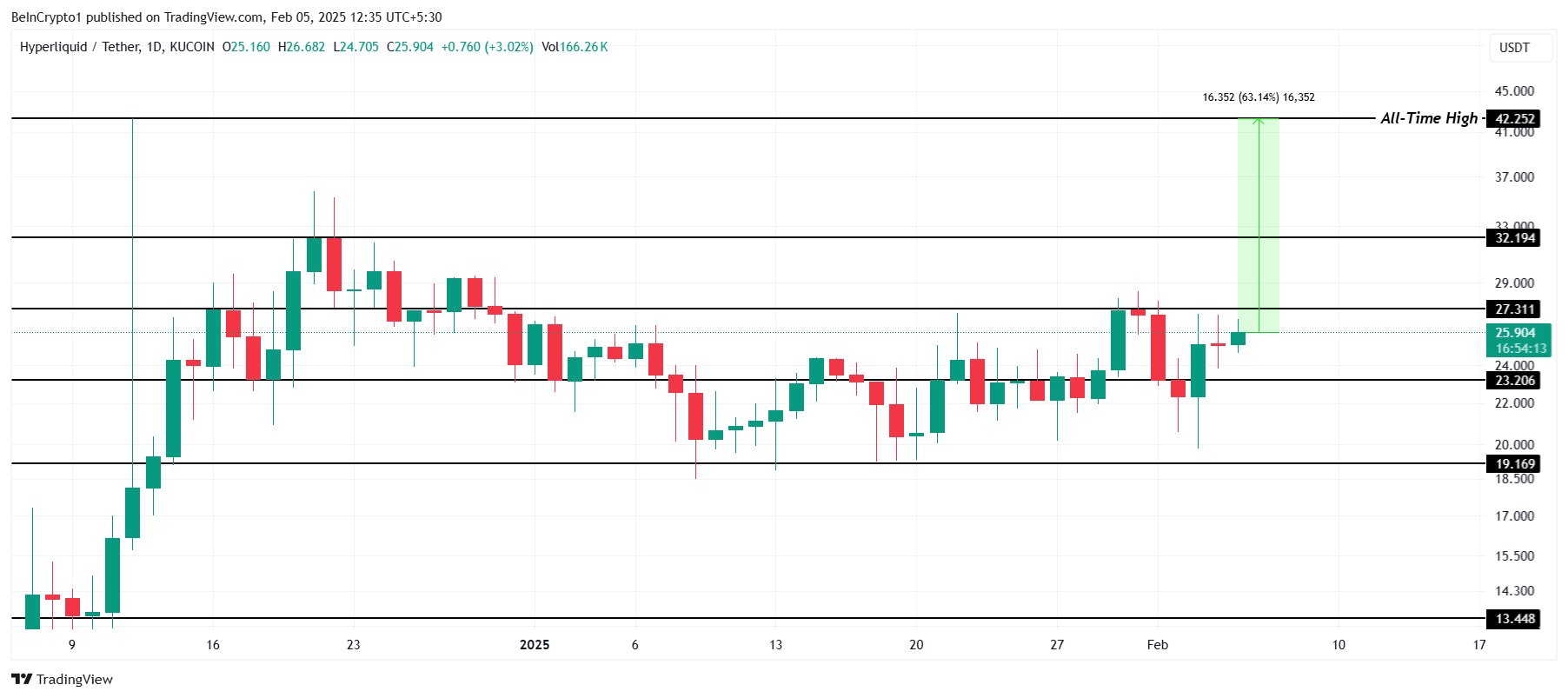 En potentiell uppgång mot 32 USD är inom räckhåll om HYPE lyckas bryta 27 USD och hålla sig över den nivån. Att uppnå detta skulle innebära framsteg mot att bryta det högsta någonsin (ATH) på 42 USD, med en 63 % ökning som behövs för att nå den nivån. Om 32 USD blir en stödnivå kan en ny ATH vara inom räckhåll.