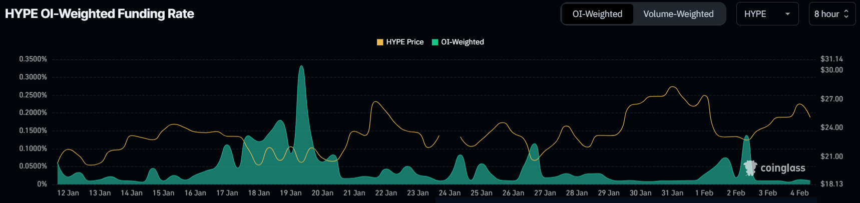 Trots den senaste bristen på prisrörelser är HYPE:s finansieringsgrad positiv, vilket visar på handlarnas fortsatta optimism. Många handlare har behållit långa kontrakt och förväntar sig en prisåterhämtning. Denna positiva inställning är viktig för att stödja en potentiell uppgång och förhindra att tokenen ser betydande nedgångar på kort sikt.