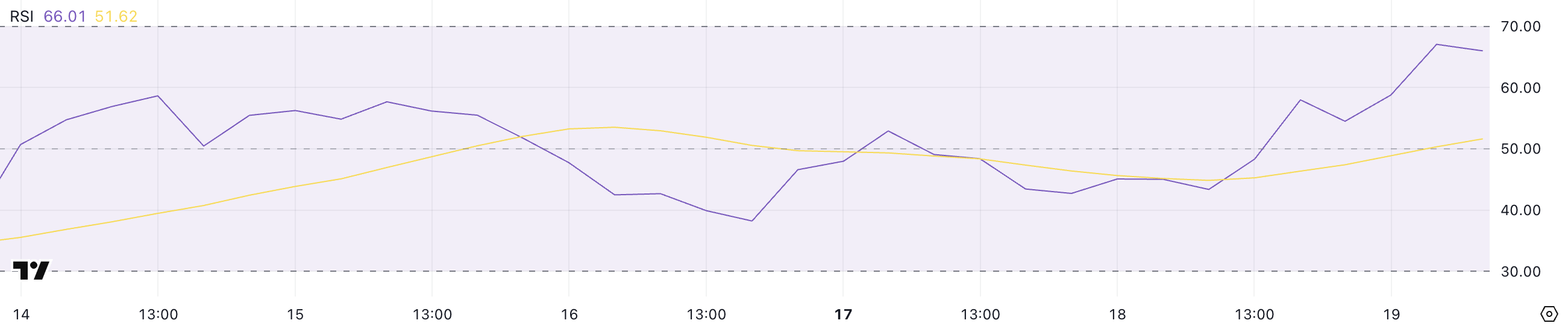 HYPE:s RSI som stiger från 54,5 till 66 indikerar växande hausseartat momentum som ännu inte har nått extrema nivåer. Denna ökning tyder på ett stärkt köparintresse medan det fortfarande ligger under den överköpta tröskeln på 70.