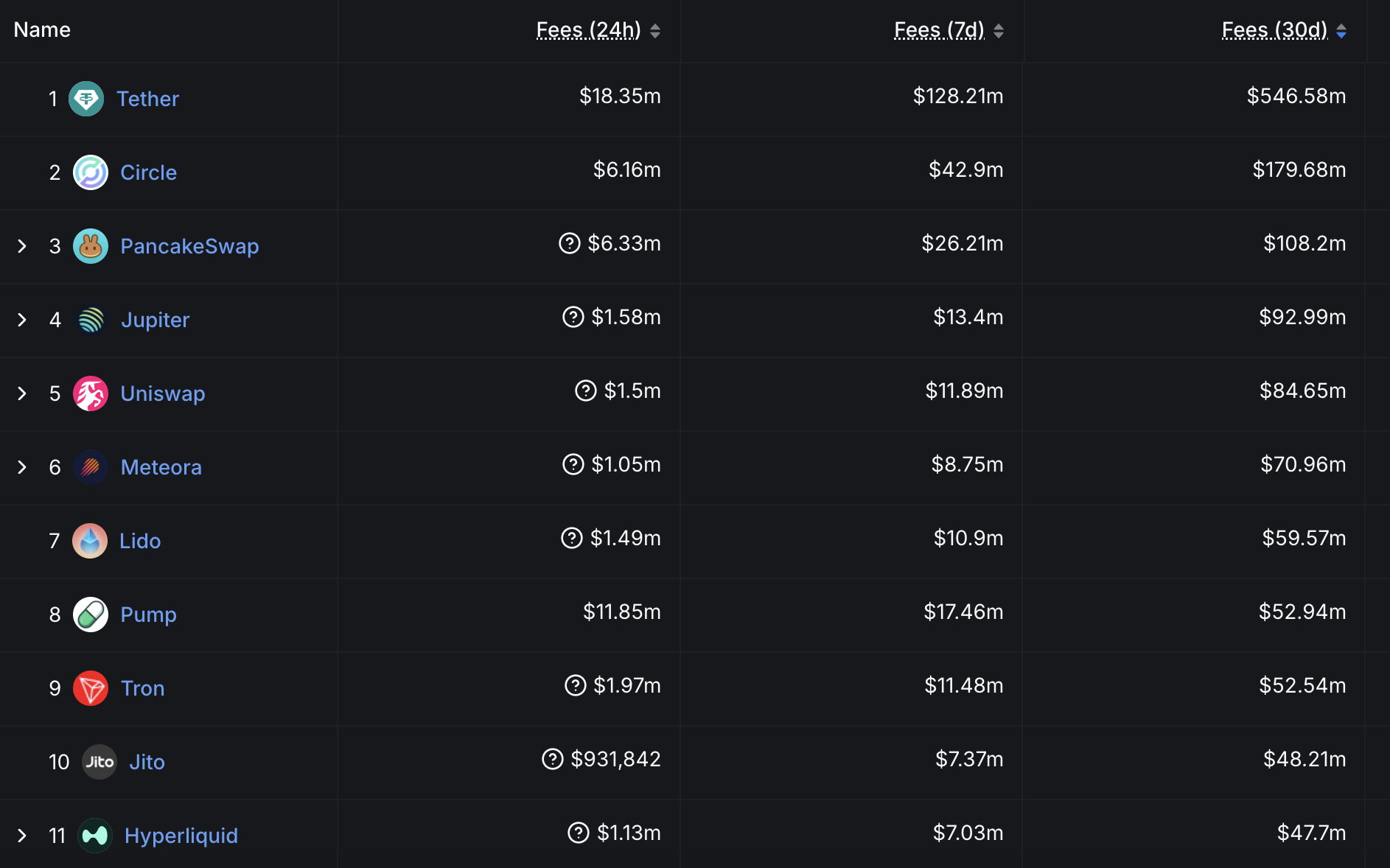 Även om detta placerar det bakom stora aktörer som Jito, Pumpfun och PancakeSwap när det gäller månadsintäkter, har Hyperliquid överträffat betydande blockkedjeappar och kedjor, inklusive Solana, Ethereum, Raydium och Phantom.