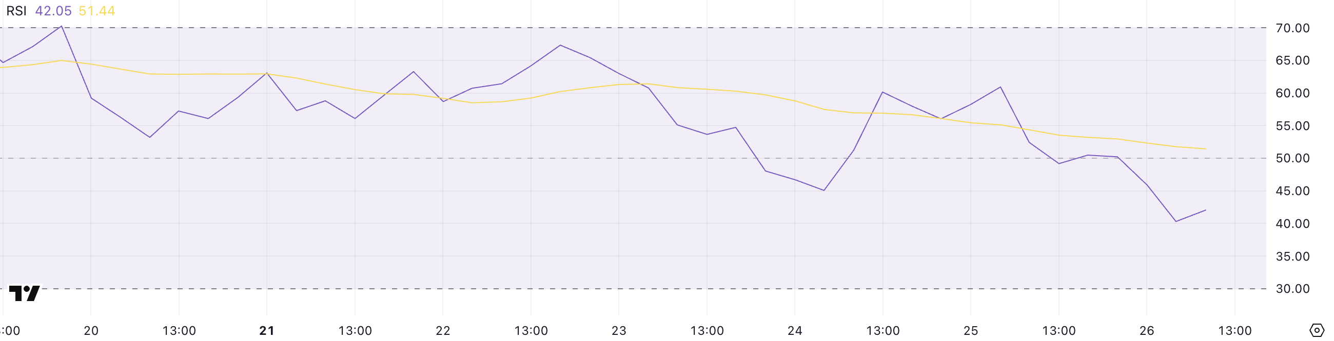 Hyperliquids Relative Strength Index (RSI) svalnar kraftigt och sjunker till 42 från 60,93 igår.